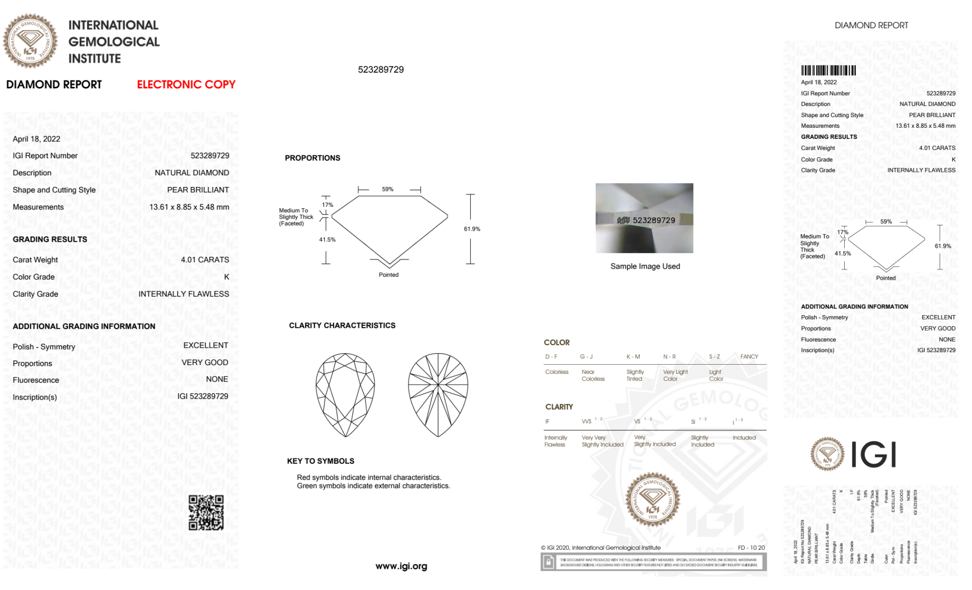 Your 4.01 carat Pear natural diamond is graded IF clarity, which stands for Internally Flawless. Read more about IF clarity diamonds here, or learn more about diamond clarity in general here.