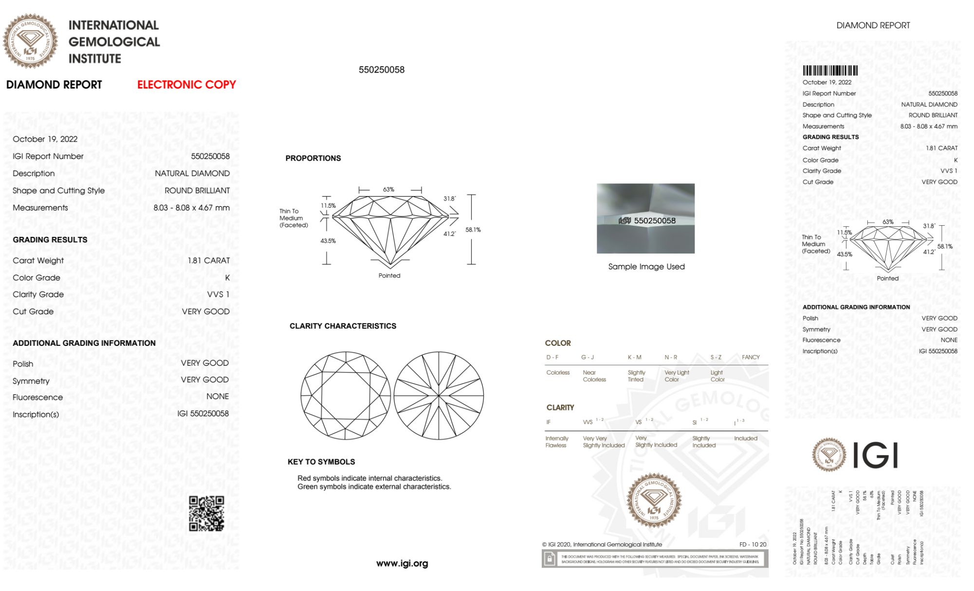 Your 1.81 carat Round natural diamond is graded VVS1 clarity, which stands for Very Very Slightly Included 1. Read more about VVS1 clarity diamonds here, or learn more about diamond clarity in general here.