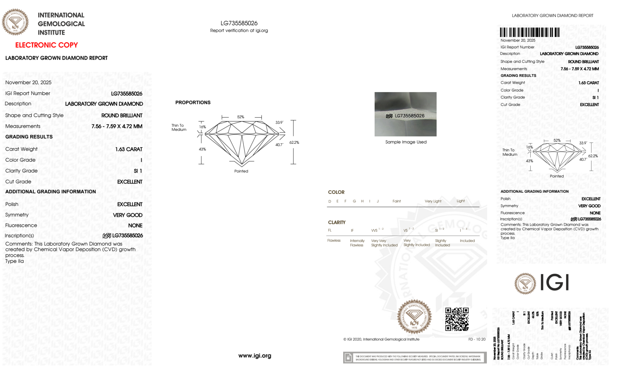 Your 1.63 carat Round lab diamond is graded SI1 clarity, which stands for Slightly Included 1. Read more about SI1 clarity diamonds here, or learn more about diamond clarity in general here.