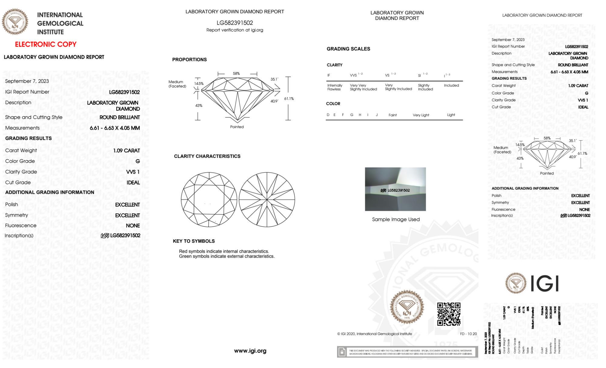 Your 1.09 carat Round lab diamond is graded G color (Near Colorless), and you can read more about G color diamonds here.