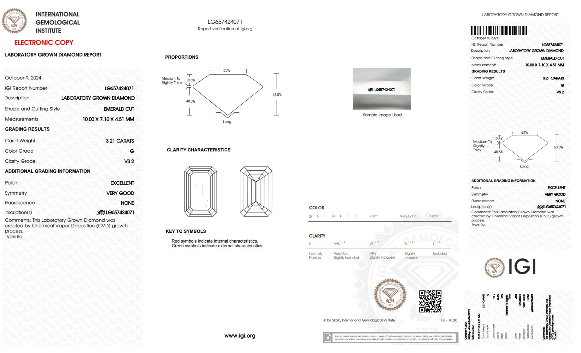 Your 3.21 carat Emerald lab diamond is graded G color (Near Colorless), and you can read more about G color diamonds here.