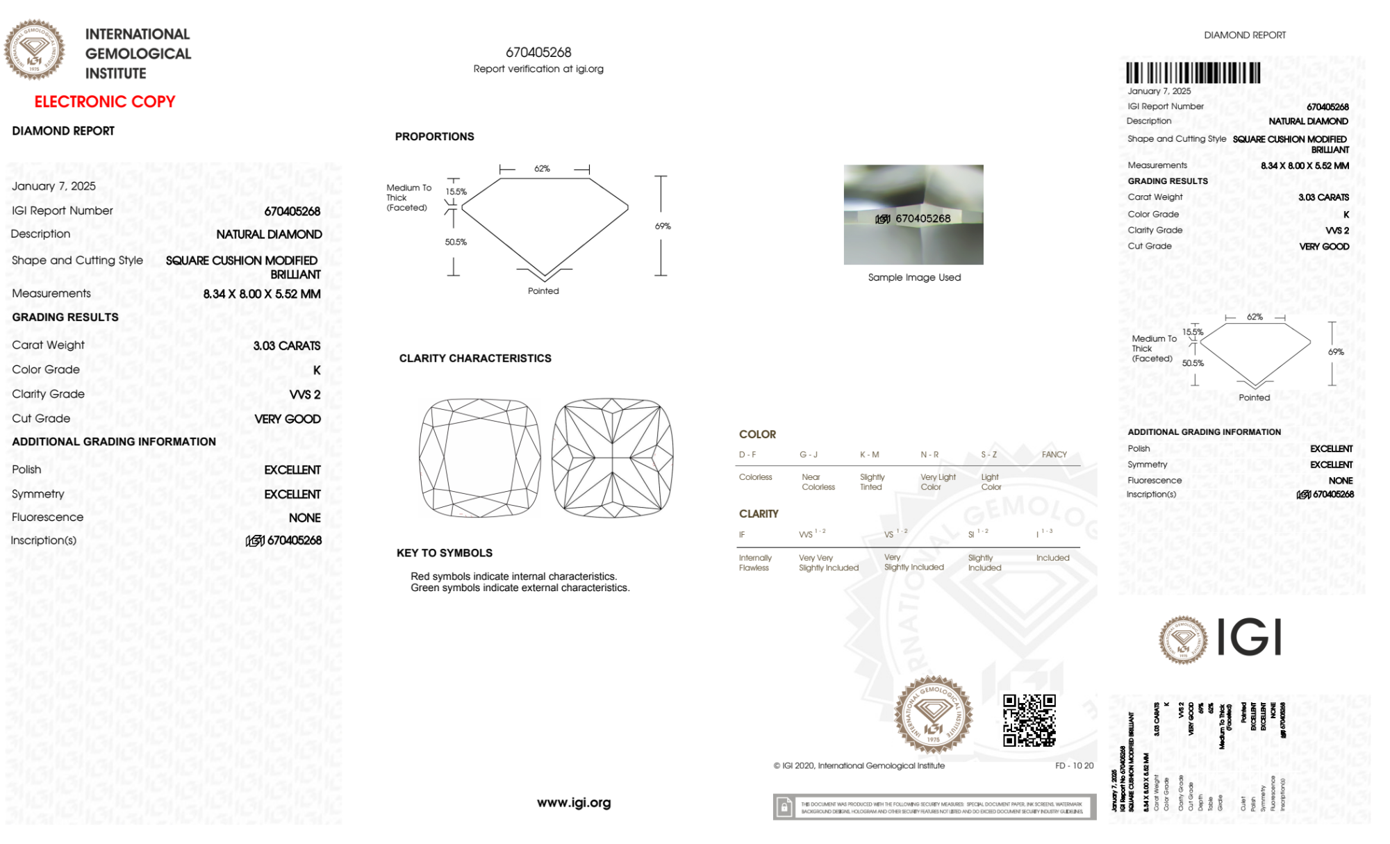 Your 3.03 carat Cushion natural diamond is graded VVS2 clarity, which stands for Very Very Slightly Included 2. Read more about VVS2 clarity diamonds here, or learn more about diamond clarity in general here.