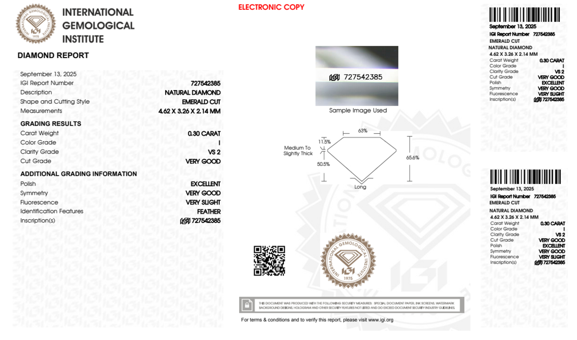 Your 0.30 carat Emerald natural diamond is graded VS2 clarity, which stands for Very Slightly Included 2. Read more about VS2 clarity diamonds here, or learn more about diamond clarity in general here.