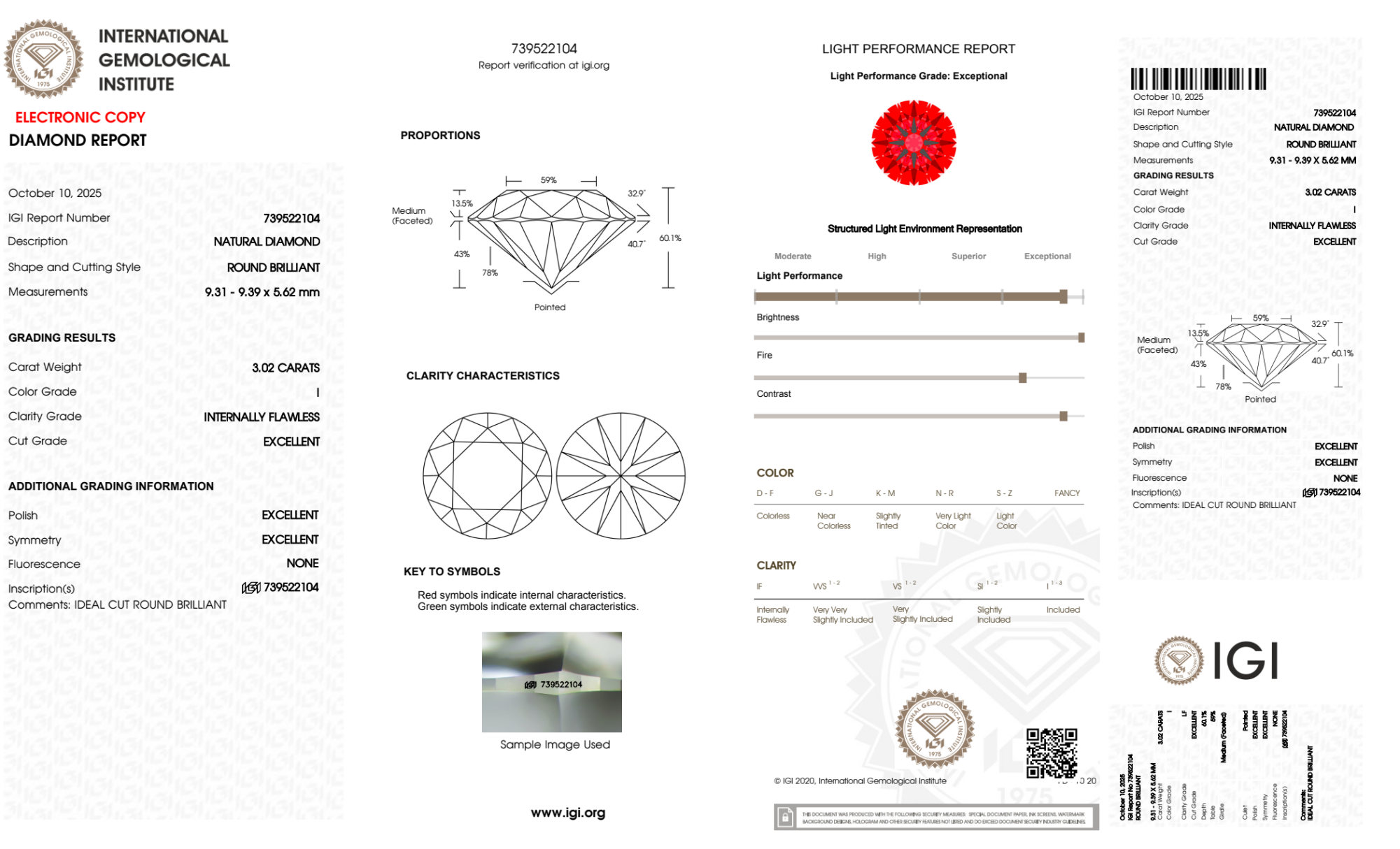 Your 3.02 carat Round natural diamond is graded IF clarity, which stands for Internally Flawless. Read more about IF clarity diamonds here, or learn more about diamond clarity in general here.
