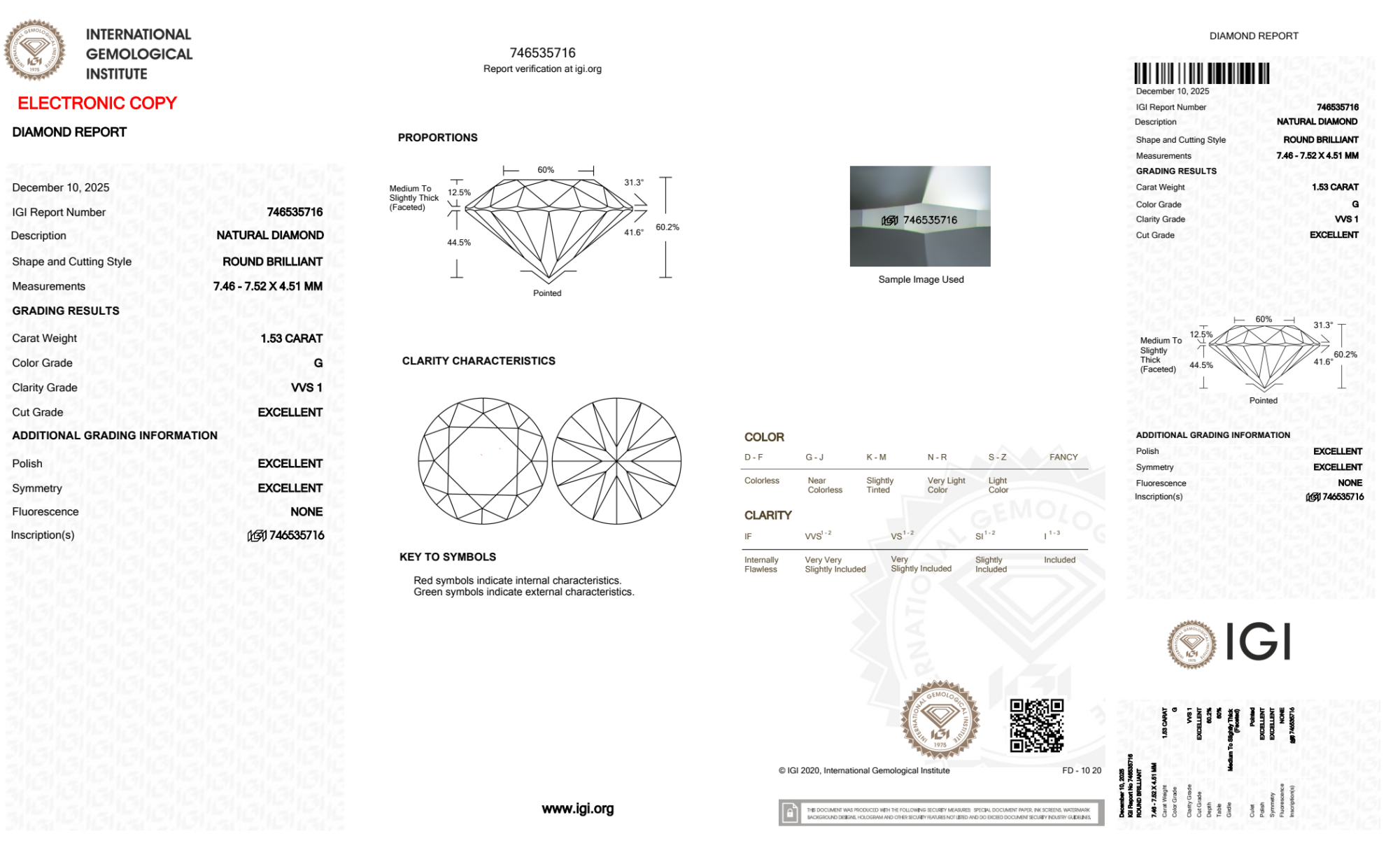 Your 1.53 carat Round natural diamond is graded VVS1 clarity, which stands for Very Very Slightly Included 1. Read more about VVS1 clarity diamonds here, or learn more about diamond clarity in general here.