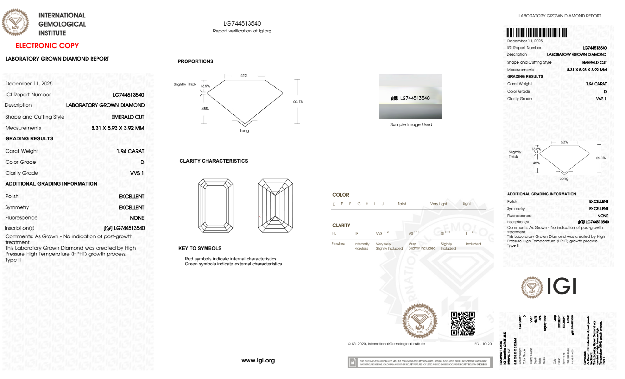 Your 1.94 carat Emerald lab diamond is graded VVS1 clarity, which stands for Very Very Slightly Included 1. Read more about VVS1 clarity diamonds here, or learn more about diamond clarity in general here.