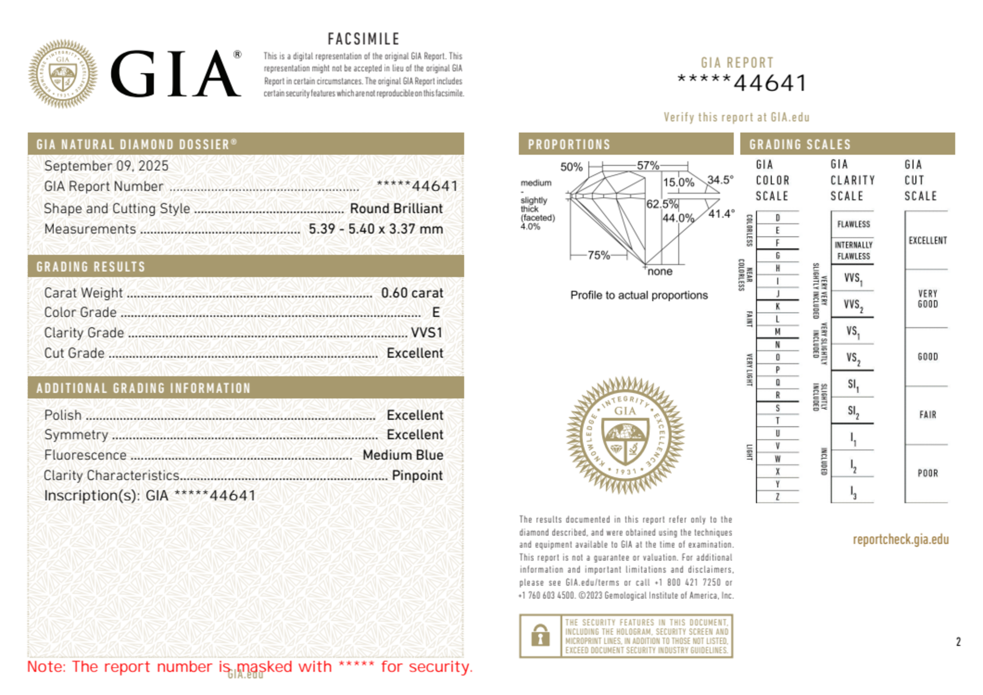 Your 0.60 carat Round natural diamond is graded E color (Colorless), and you can read more about E color diamonds here.