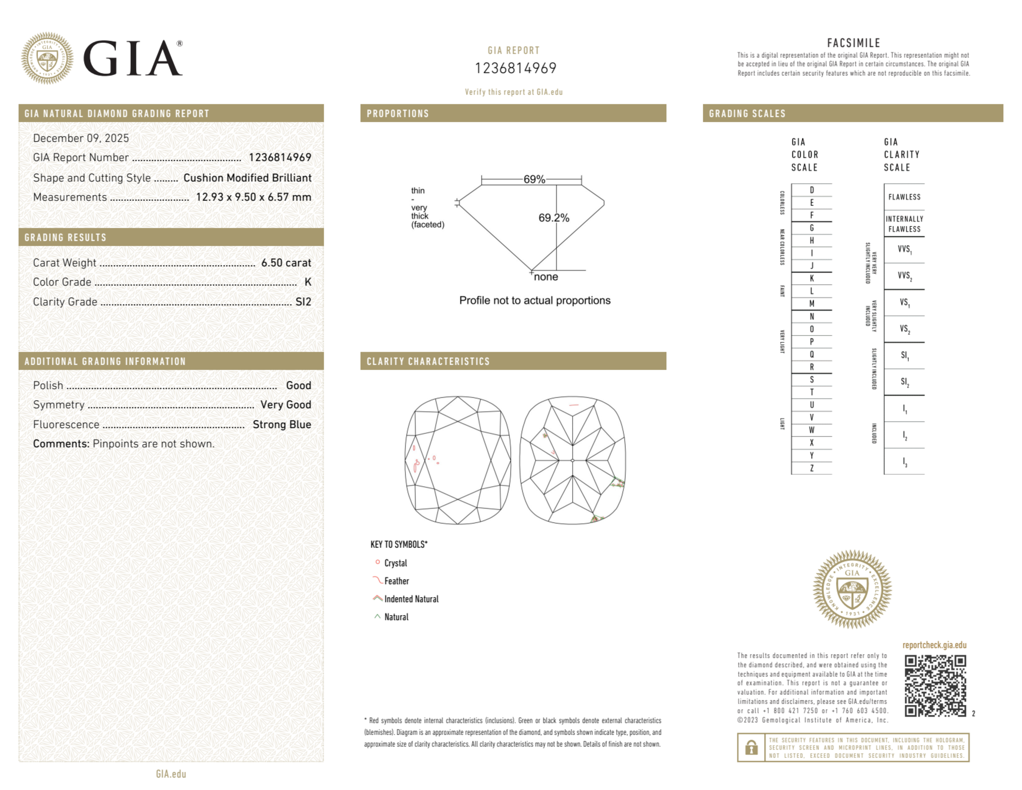 Your 6.50 carat Cushion natural diamond is graded SI2 clarity, which stands for Slightly Included 2. Read more about SI2 clarity diamonds here, or learn more about diamond clarity in general here.