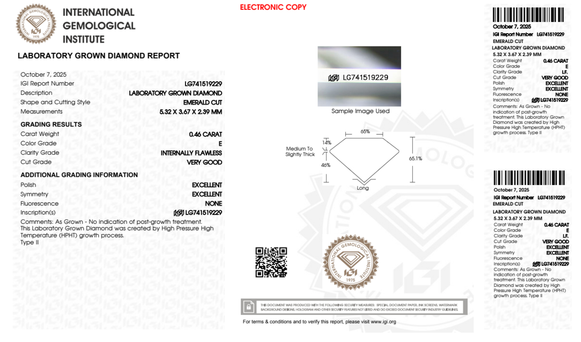 Your 0.46 carat Emerald lab diamond is graded IF clarity, which stands for Internally Flawless. Read more about IF clarity diamonds here, or learn more about diamond clarity in general here.