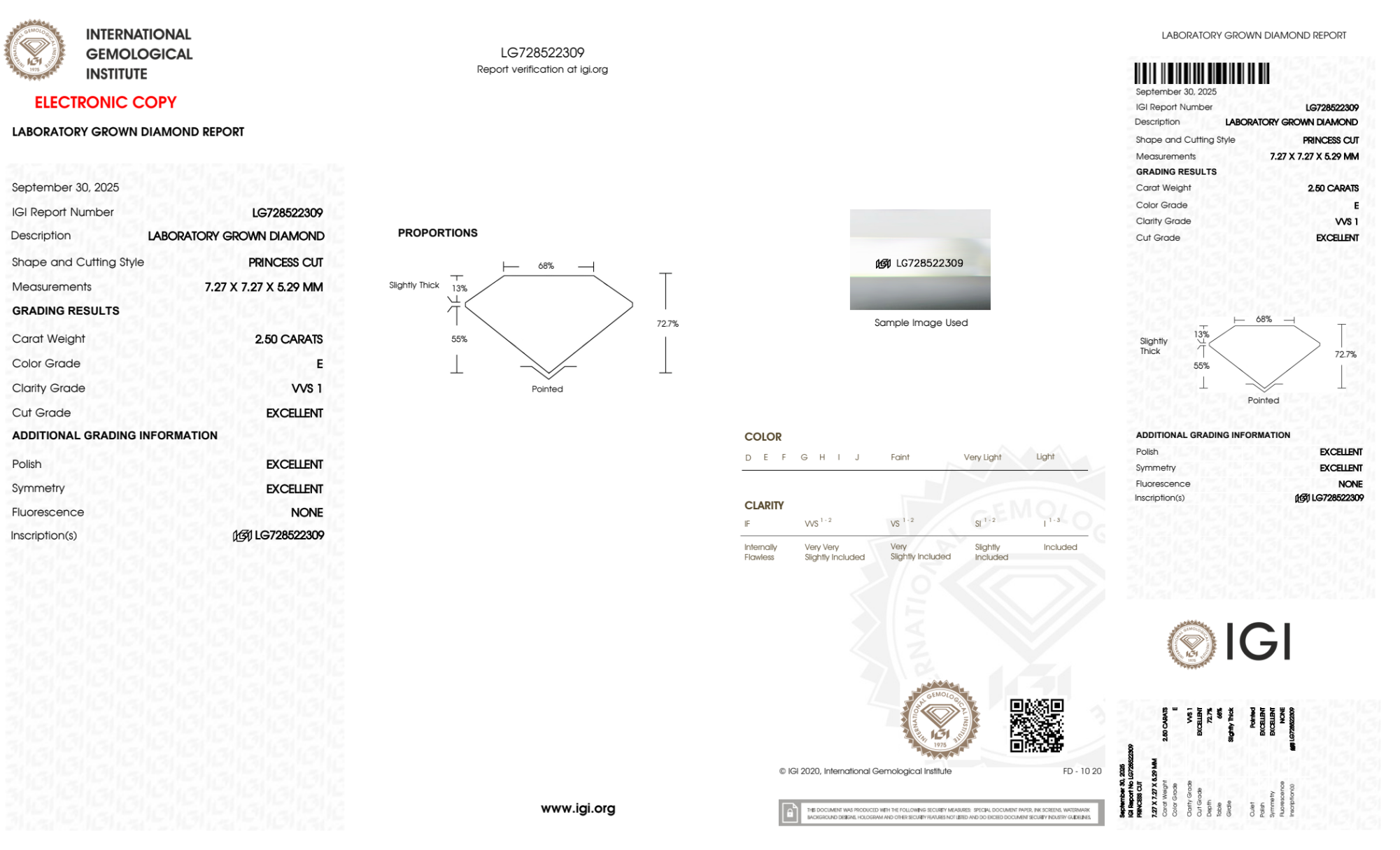 Your 2.50 carat Princess lab diamond is graded E color (Colorless), and you can read more about E color diamonds here.