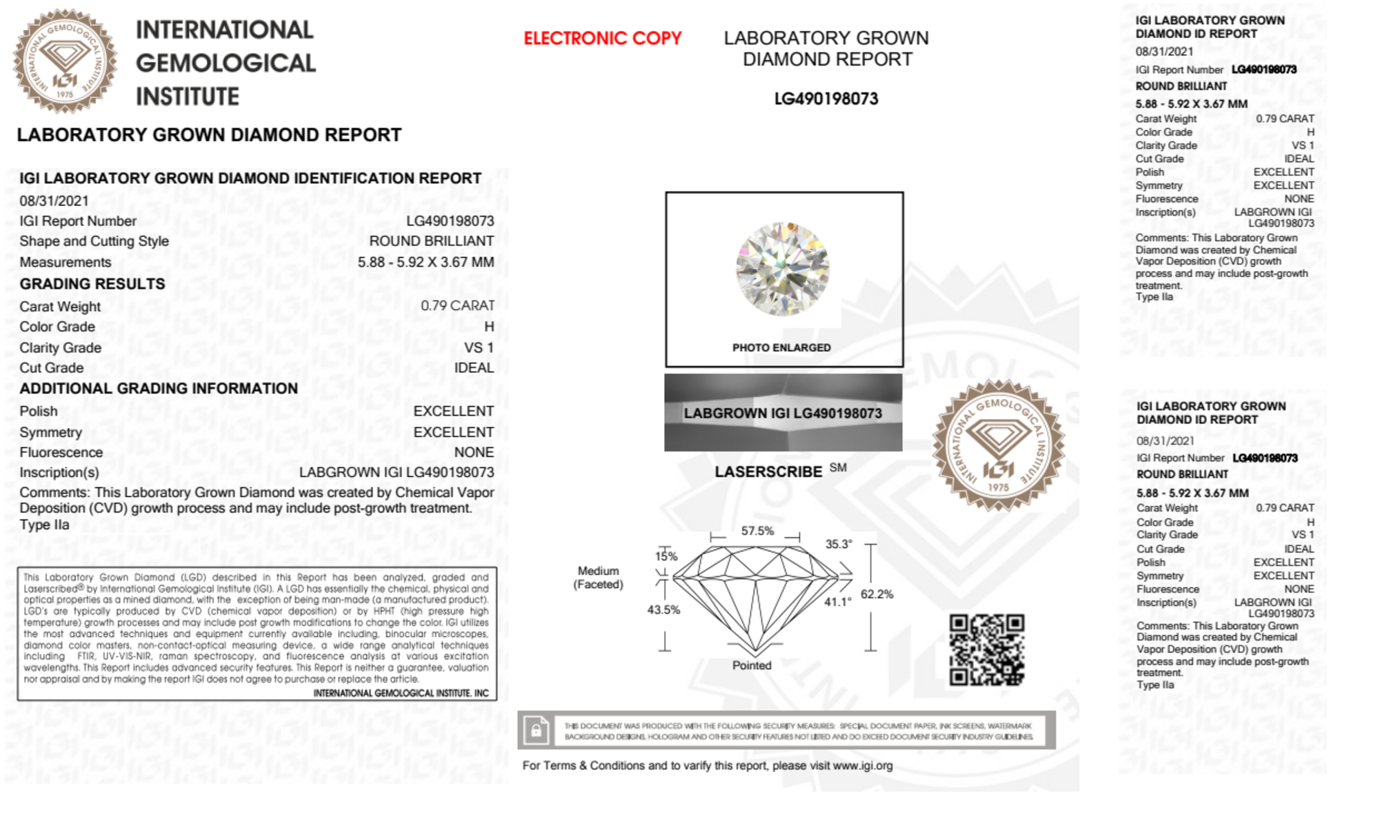 Your 0.79 carat Round lab diamond is graded H color (Near Colorless), and you can read more about H color diamonds here.
