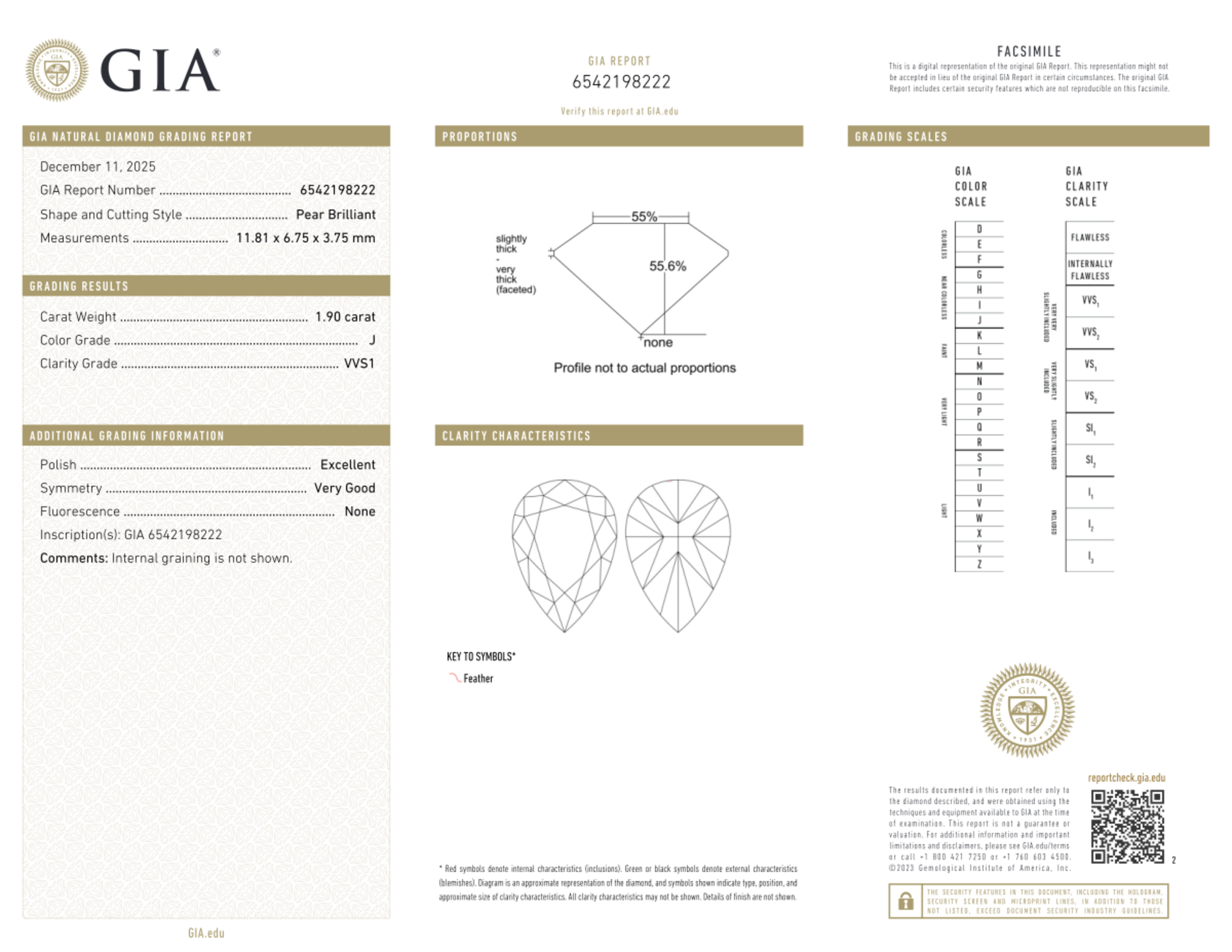 Your 1.90 carat Pear natural diamond is graded VVS1 clarity, which stands for Very Very Slightly Included 1. Read more about VVS1 clarity diamonds here, or learn more about diamond clarity in general here.