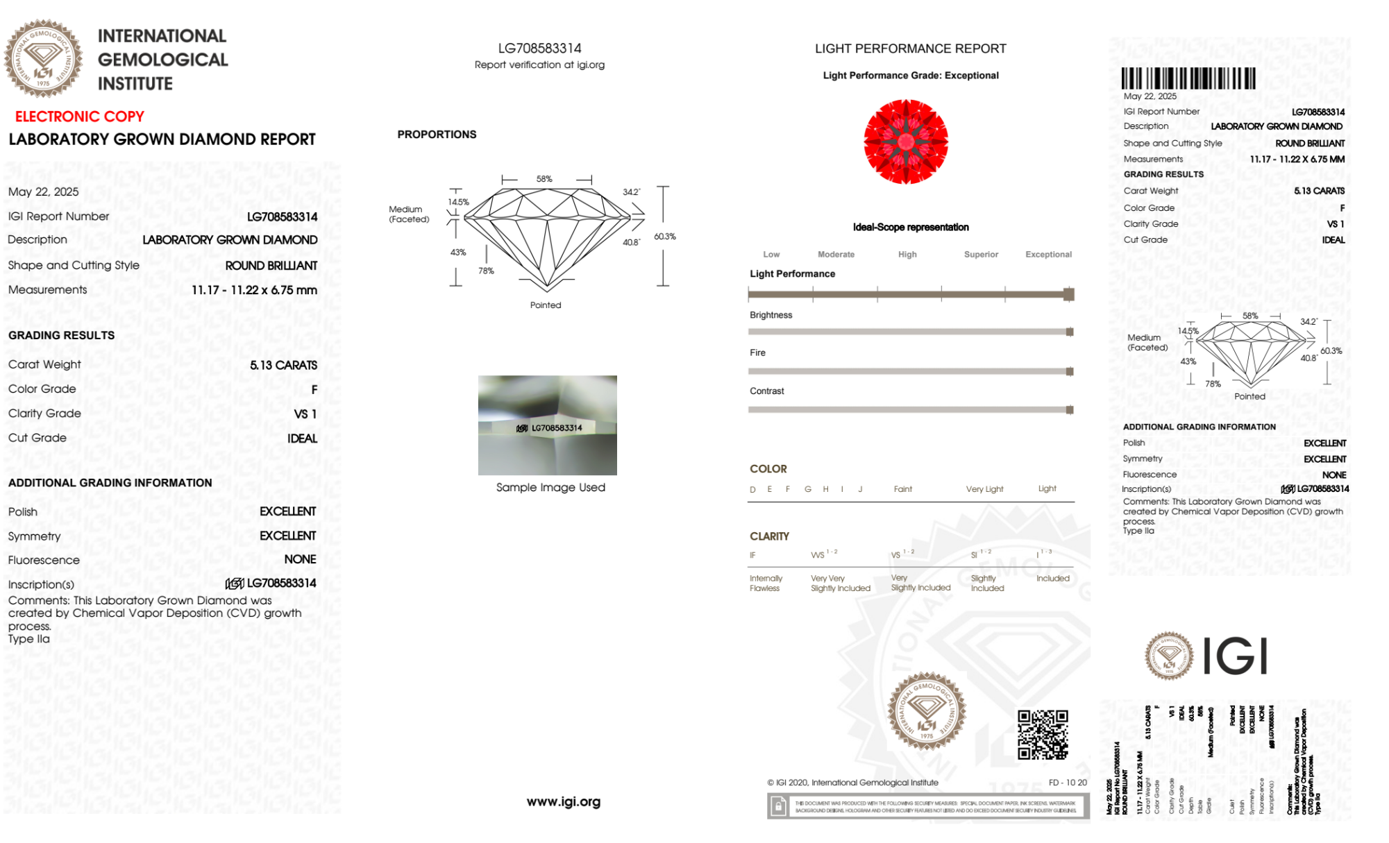 Your 5.13 carat Round lab diamond is graded F color (Colorless), and you can read more about F color diamonds here.