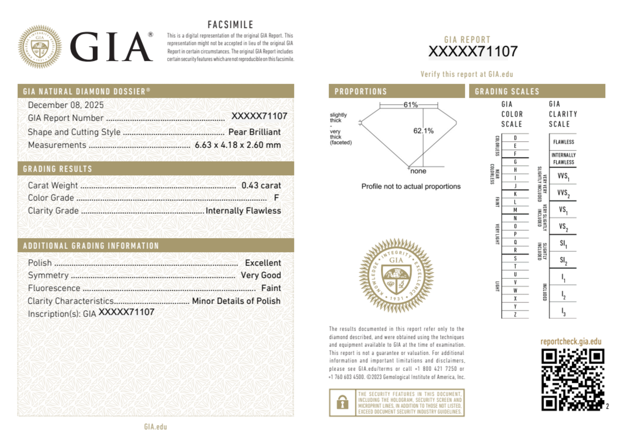 Your 0.43 carat Pear natural diamond is graded IF clarity, which stands for Internally Flawless. Read more about IF clarity diamonds here, or learn more about diamond clarity in general here.