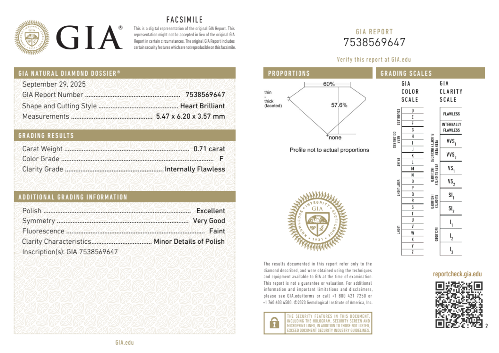 Your 0.71 carat Heart natural diamond is graded F color (Colorless), and you can read more about F color diamonds here.