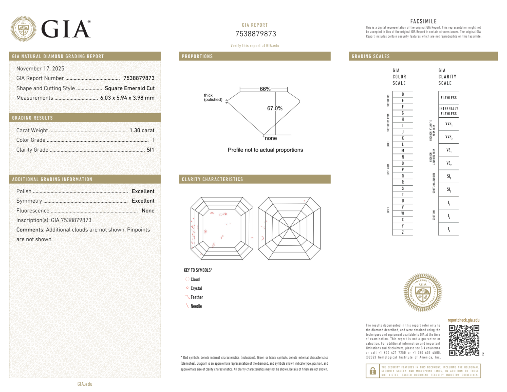 Your 1.30 carat Asscher natural diamond is graded SI1 clarity, which stands for Slightly Included 1. Read more about SI1 clarity diamonds here, or learn more about diamond clarity in general here.
