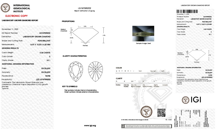 Your 6.04 carat Pear lab diamond is graded E color (Colorless), and you can read more about E color diamonds here.