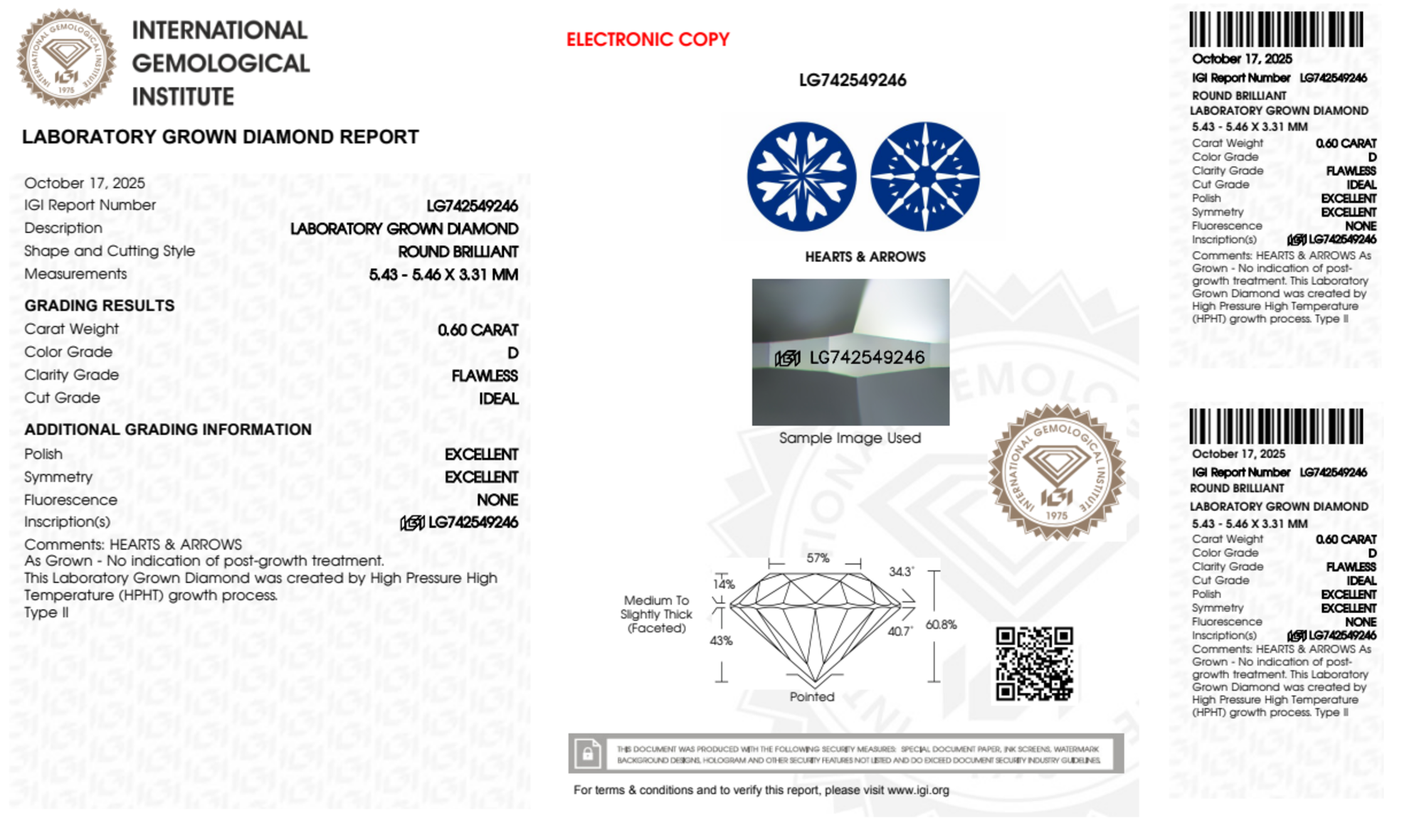 Your 0.60 carat Round lab diamond is graded FL clarity, which stands for Flawless. Read more about FL clarity diamonds here, or learn more about diamond clarity in general here.