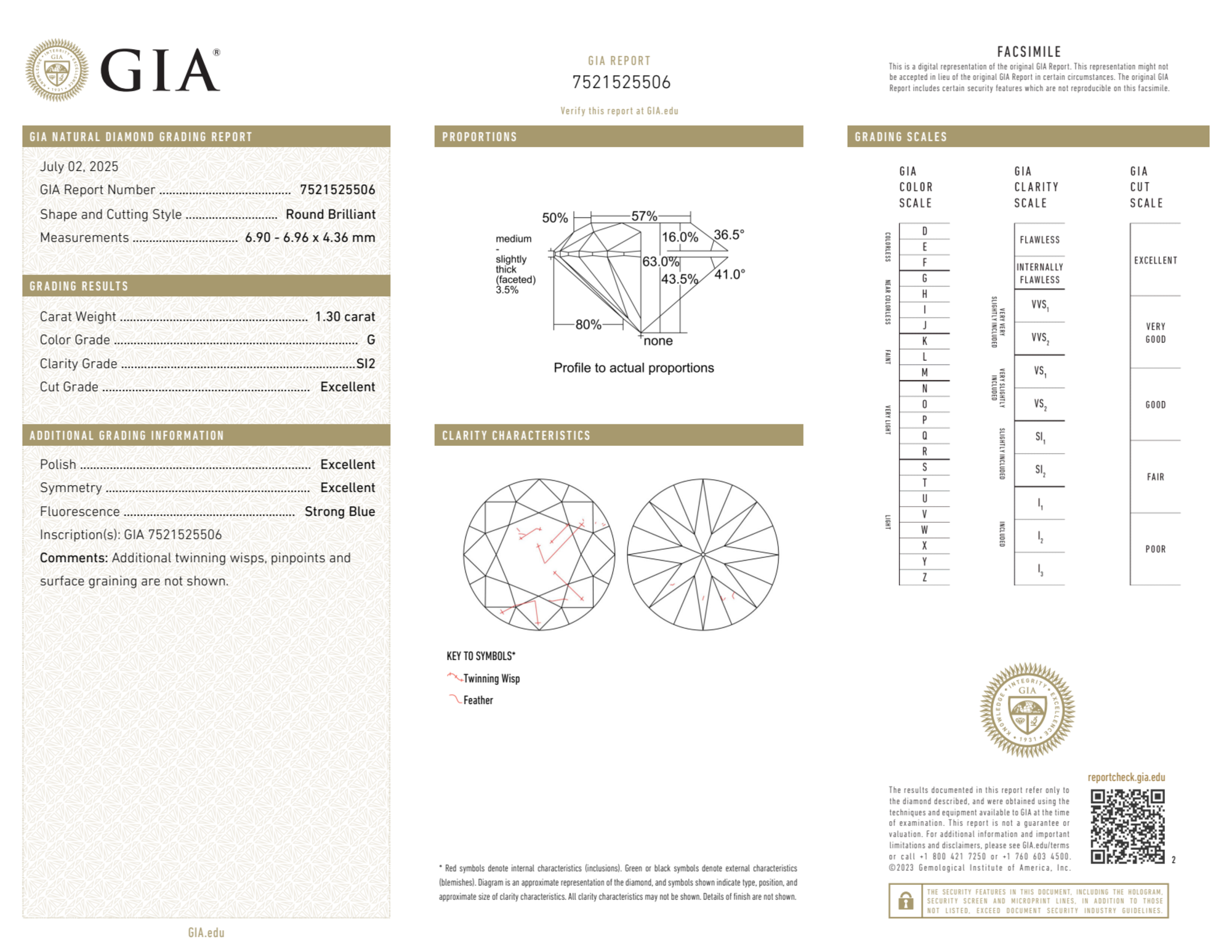 Your 1.30 carat Round natural diamond is graded G color (Near Colorless), and you can read more about G color diamonds here.