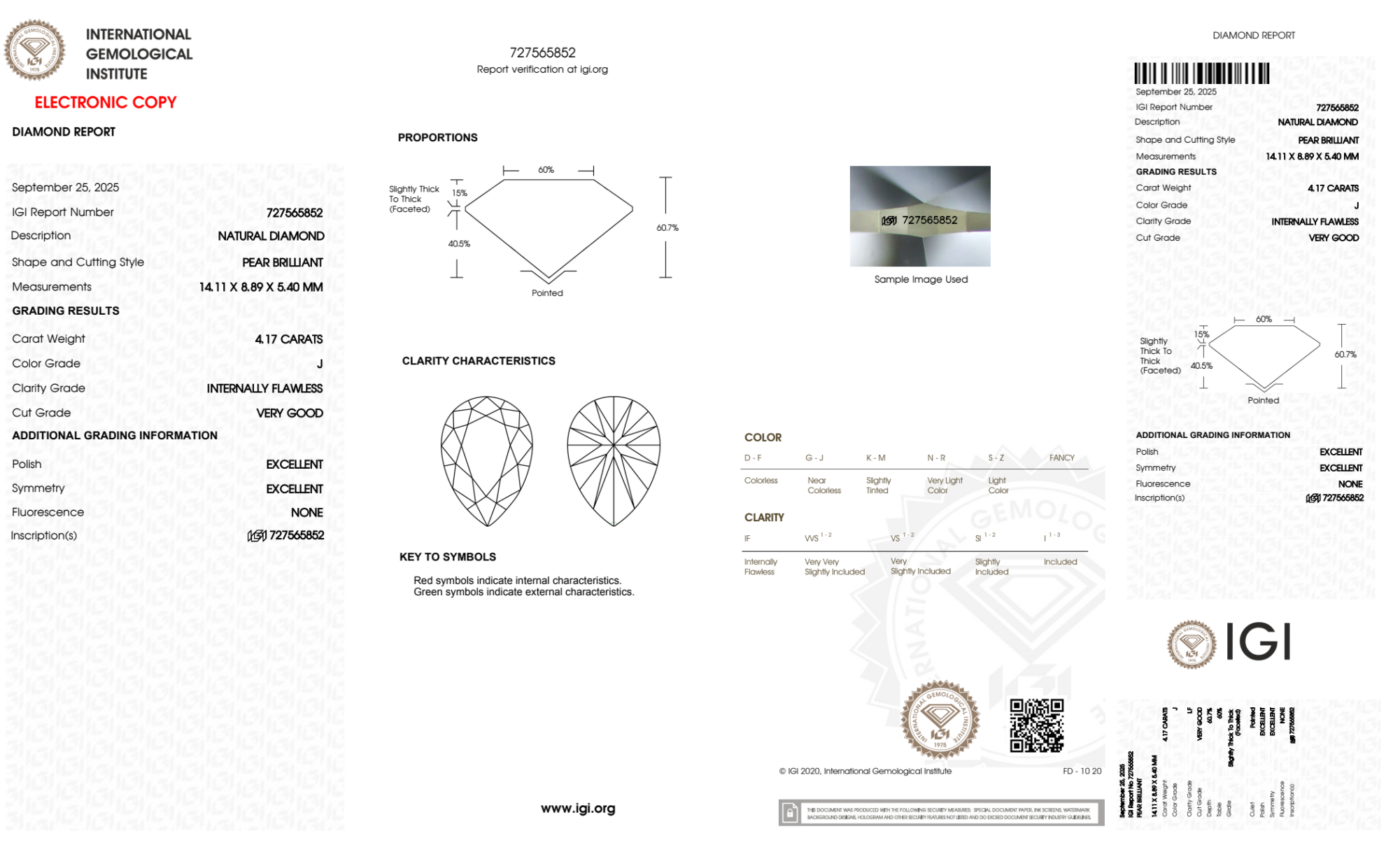 Your 4.17 carat Pear natural diamond is graded IF clarity, which stands for Internally Flawless. Read more about IF clarity diamonds here, or learn more about diamond clarity in general here.