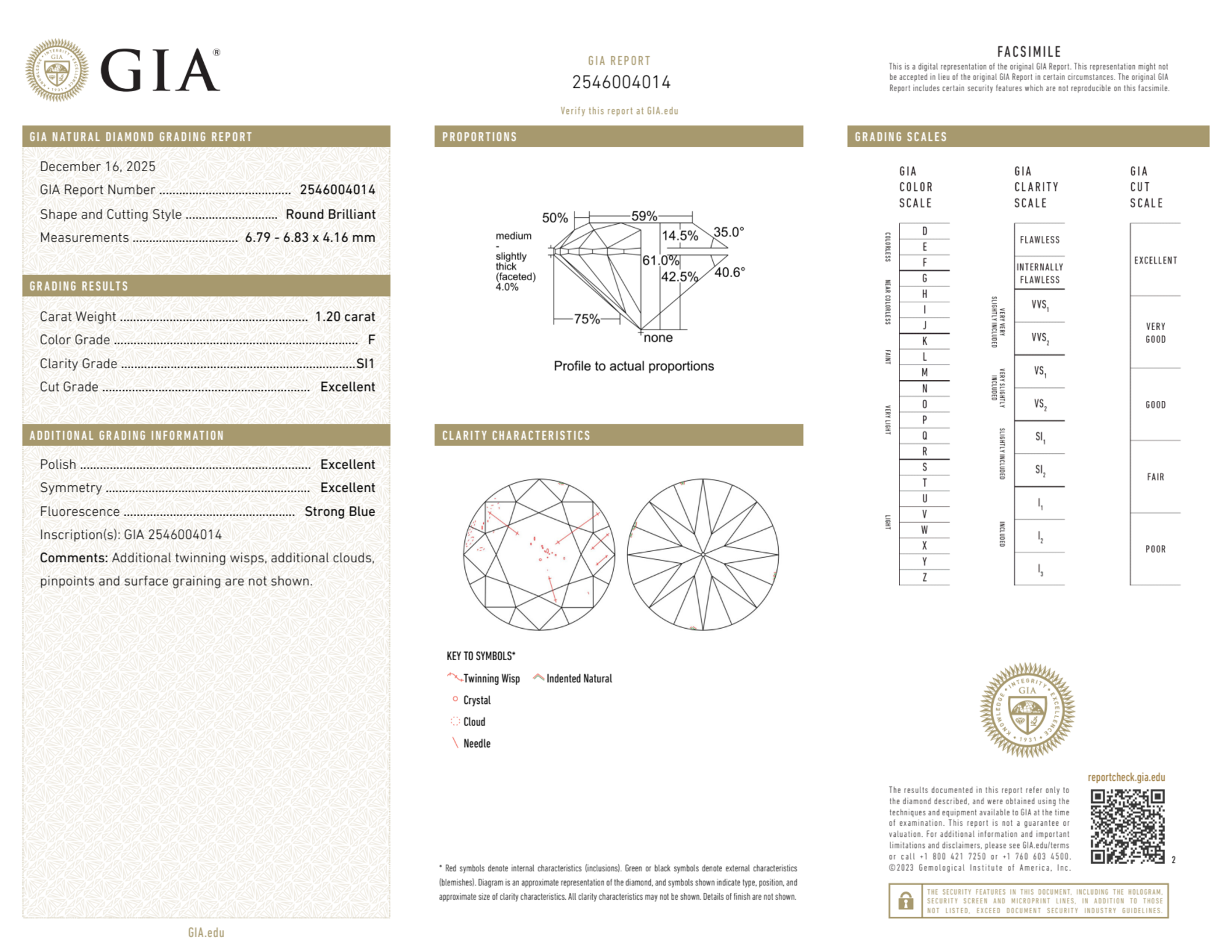 Your 1.20 carat Round natural diamond is graded F color (Colorless), and you can read more about F color diamonds here.