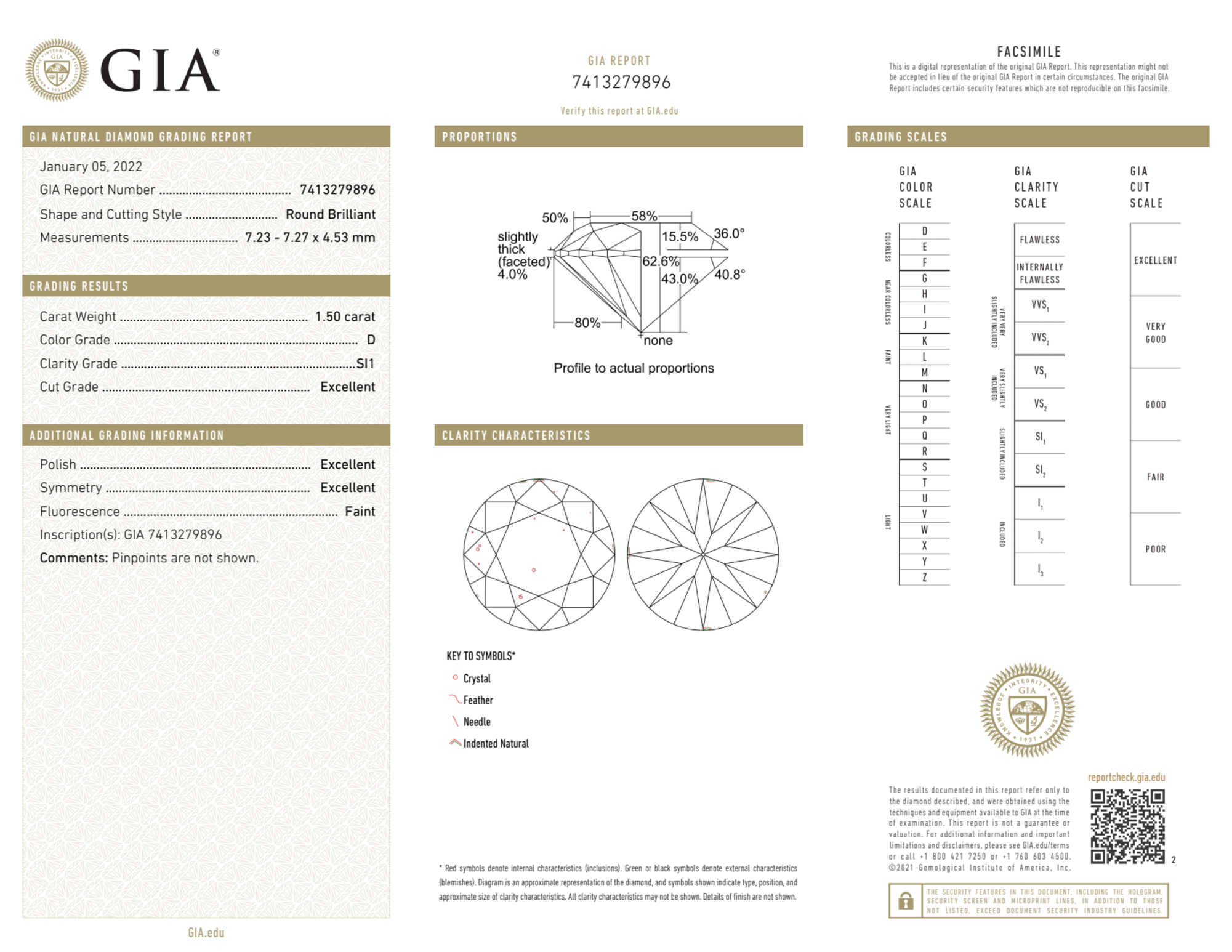 Your 1.50 carat Round natural diamond is graded SI1 clarity, which stands for Slightly Included 1. Read more about SI1 clarity diamonds here, or learn more about diamond clarity in general here.