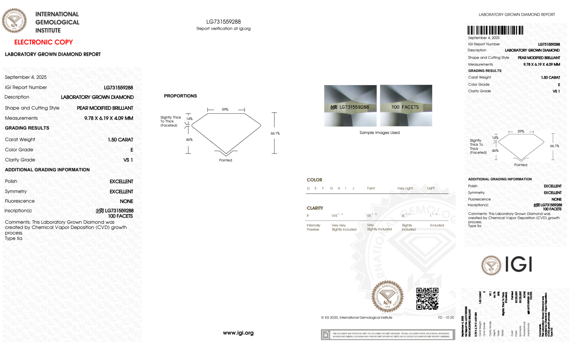 Your 1.50 carat Pear lab diamond is graded E color (Colorless), and you can read more about E color diamonds here.