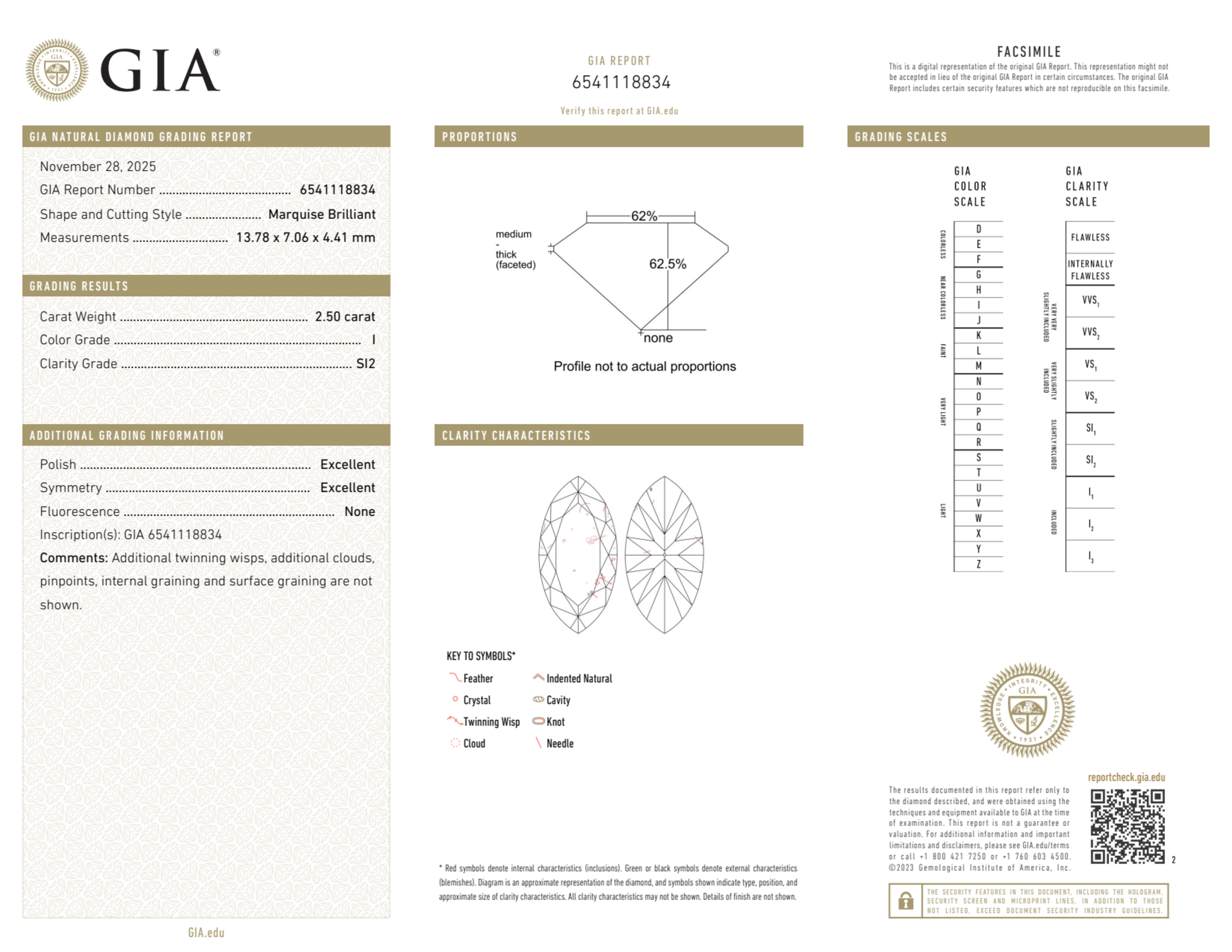 Your 2.50 carat Marquise natural diamond is graded I color (Near Colorless), and you can read more about I color diamonds here.