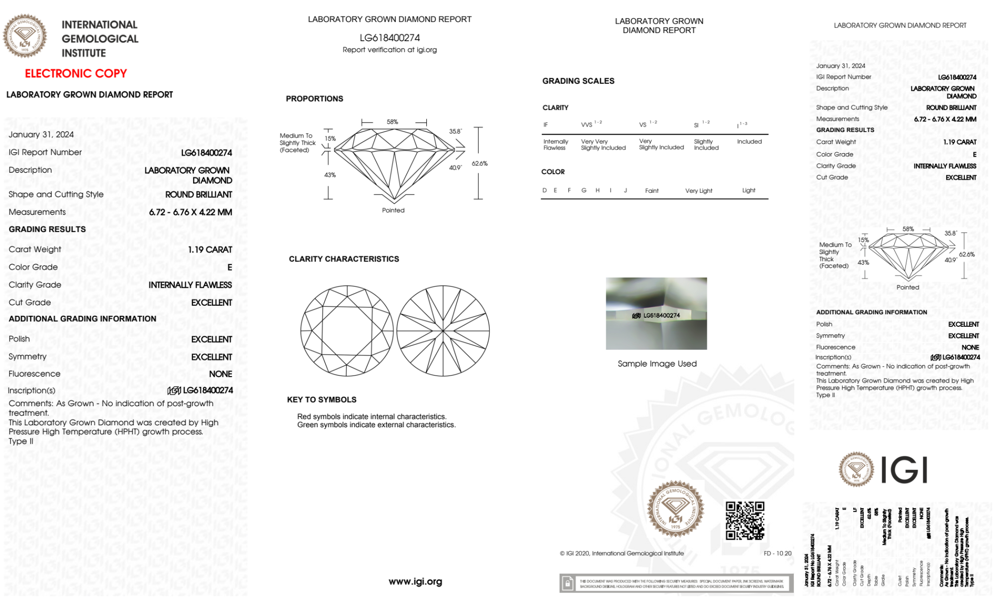 Your 1.19 carat Round lab diamond is graded IF clarity, which stands for Internally Flawless. Read more about IF clarity diamonds here, or learn more about diamond clarity in general here.