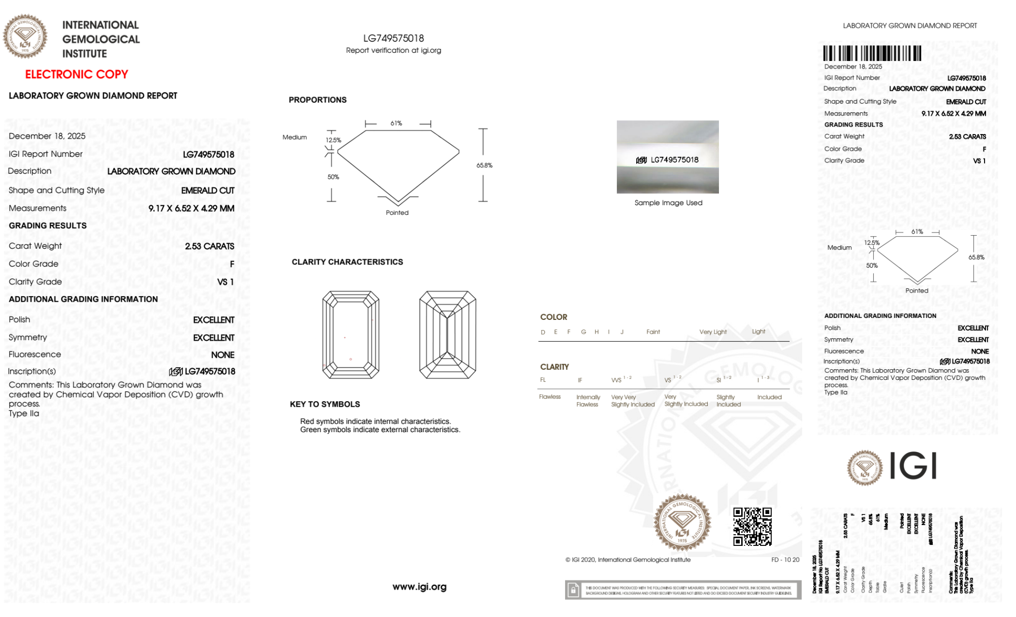 Your 2.53 carat Emerald lab diamond is graded F color (Colorless), and you can read more about F color diamonds here.