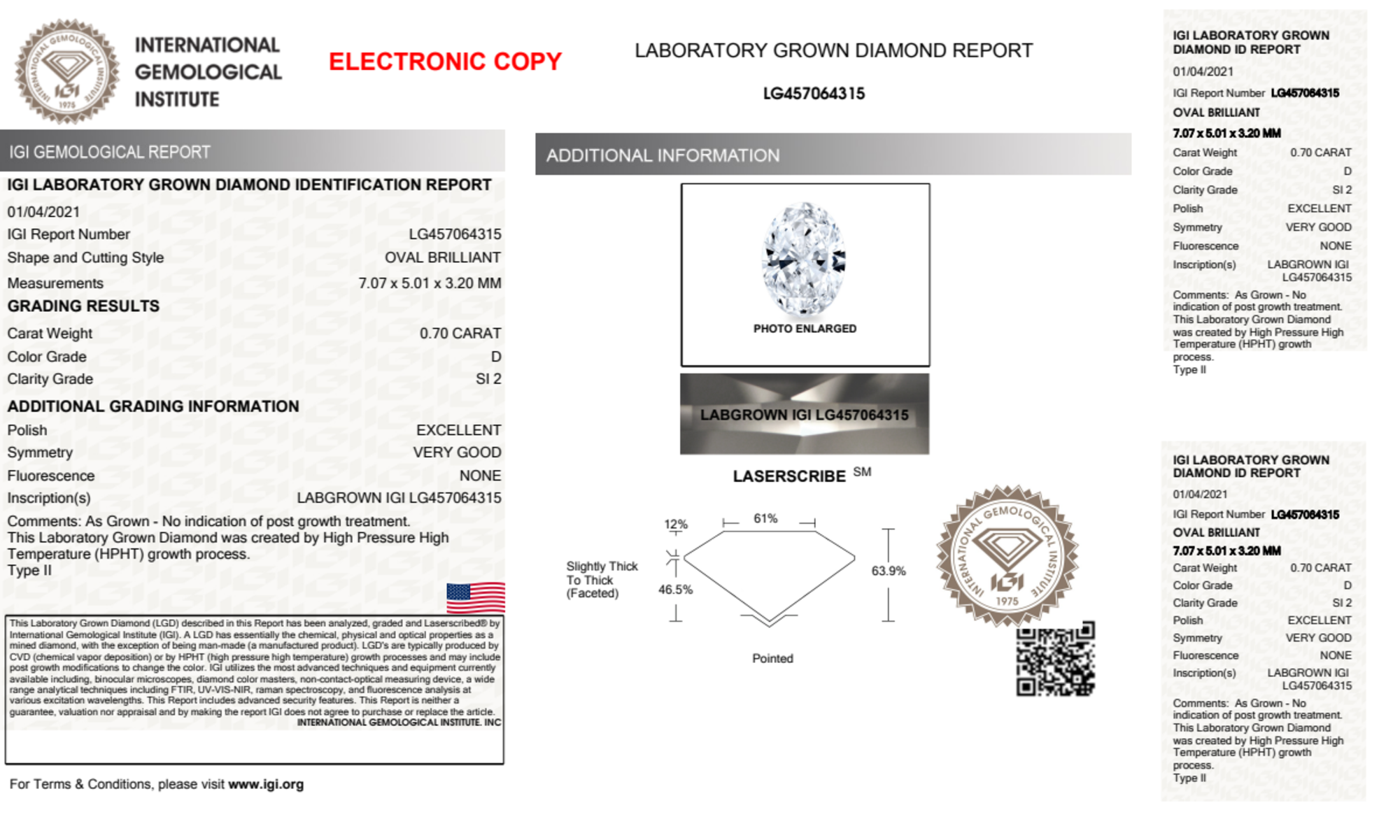 Your 0.70 carat Oval lab diamond is graded D color (Colorless), and you can read more about D color diamonds here.