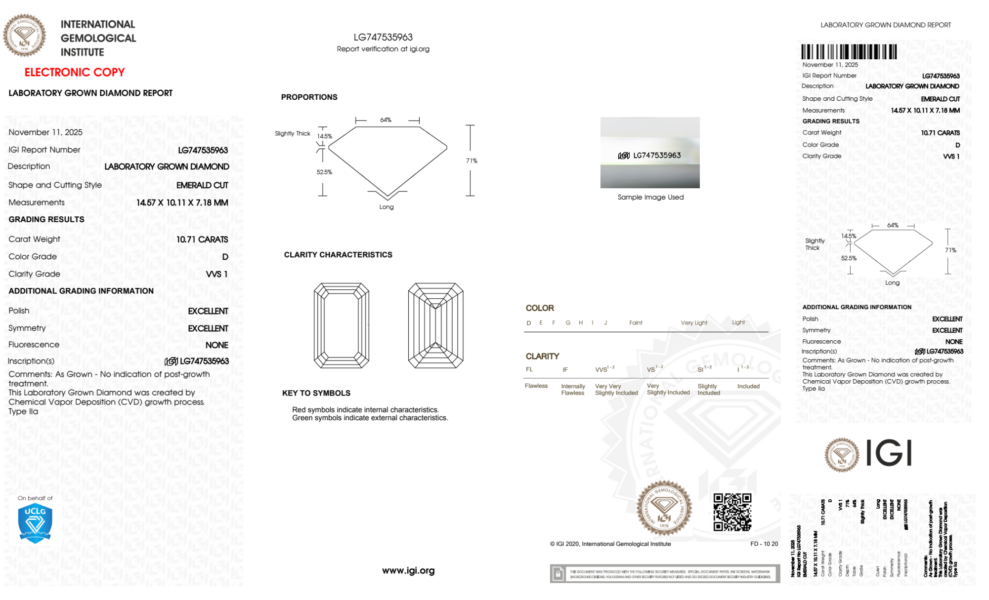 Your 10.71 carat Emerald lab diamond is graded D color (Colorless), and you can read more about D color diamonds here.