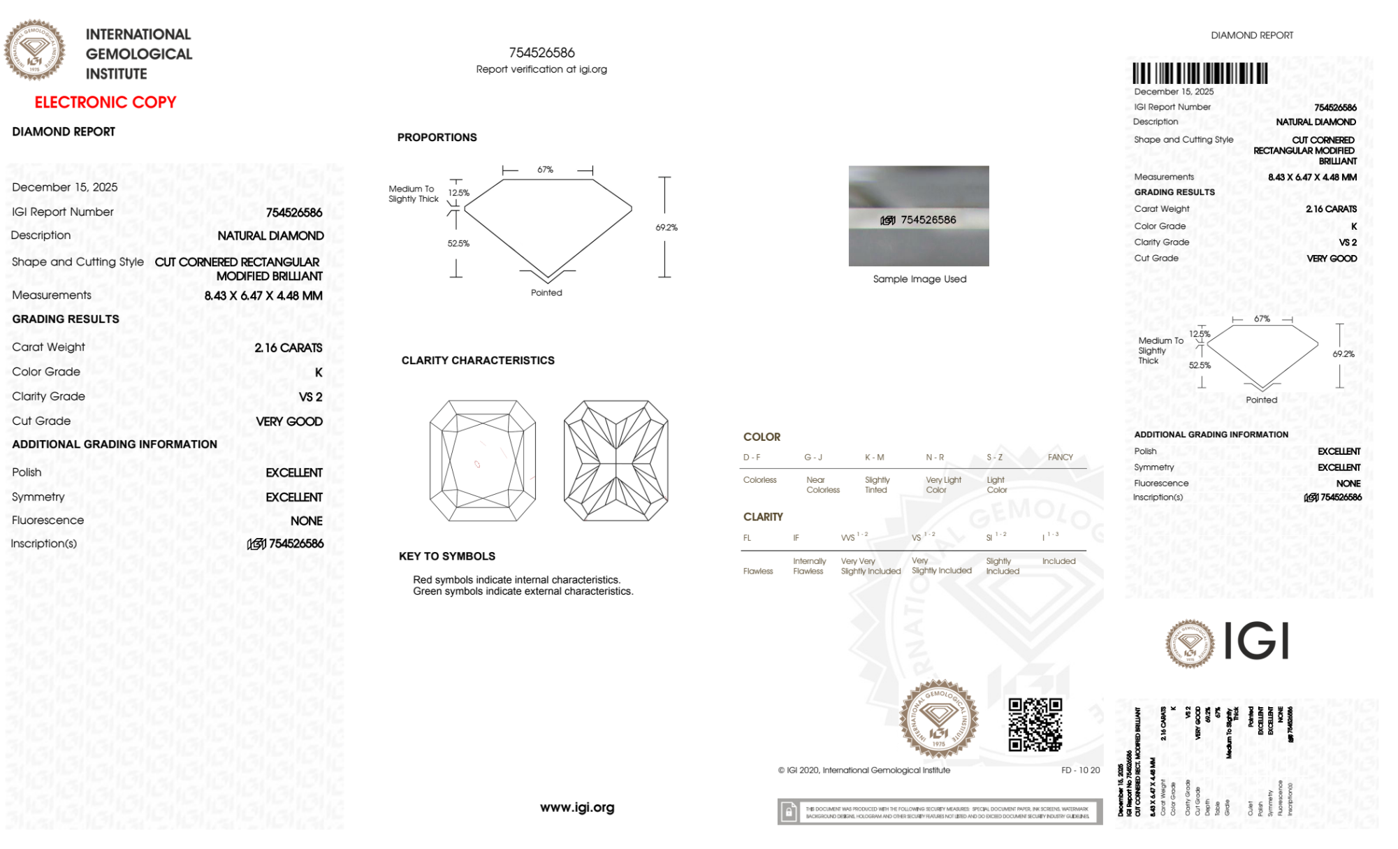 Your 2.16 carat Radiant natural diamond is graded K color (Faint Color), and you can read more about K color diamonds here.