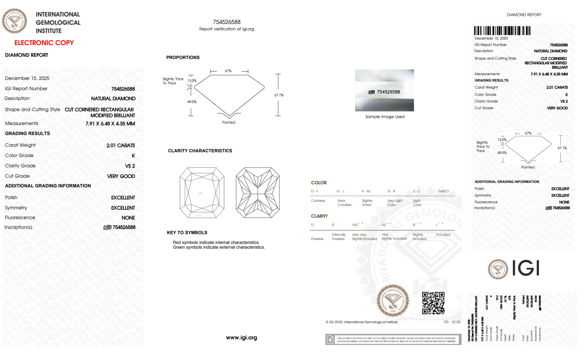 Your 2.01 carat Radiant natural diamond is graded K color (Faint Color), and you can read more about K color diamonds here.