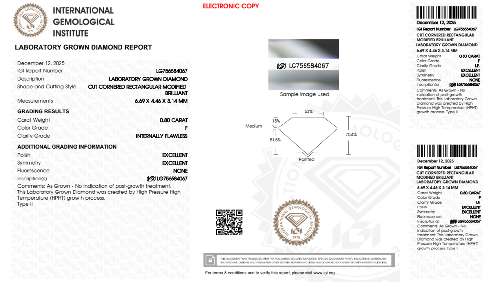 Your 0.80 carat Radiant lab diamond is graded IF clarity, which stands for Internally Flawless. Read more about IF clarity diamonds here, or learn more about diamond clarity in general here.