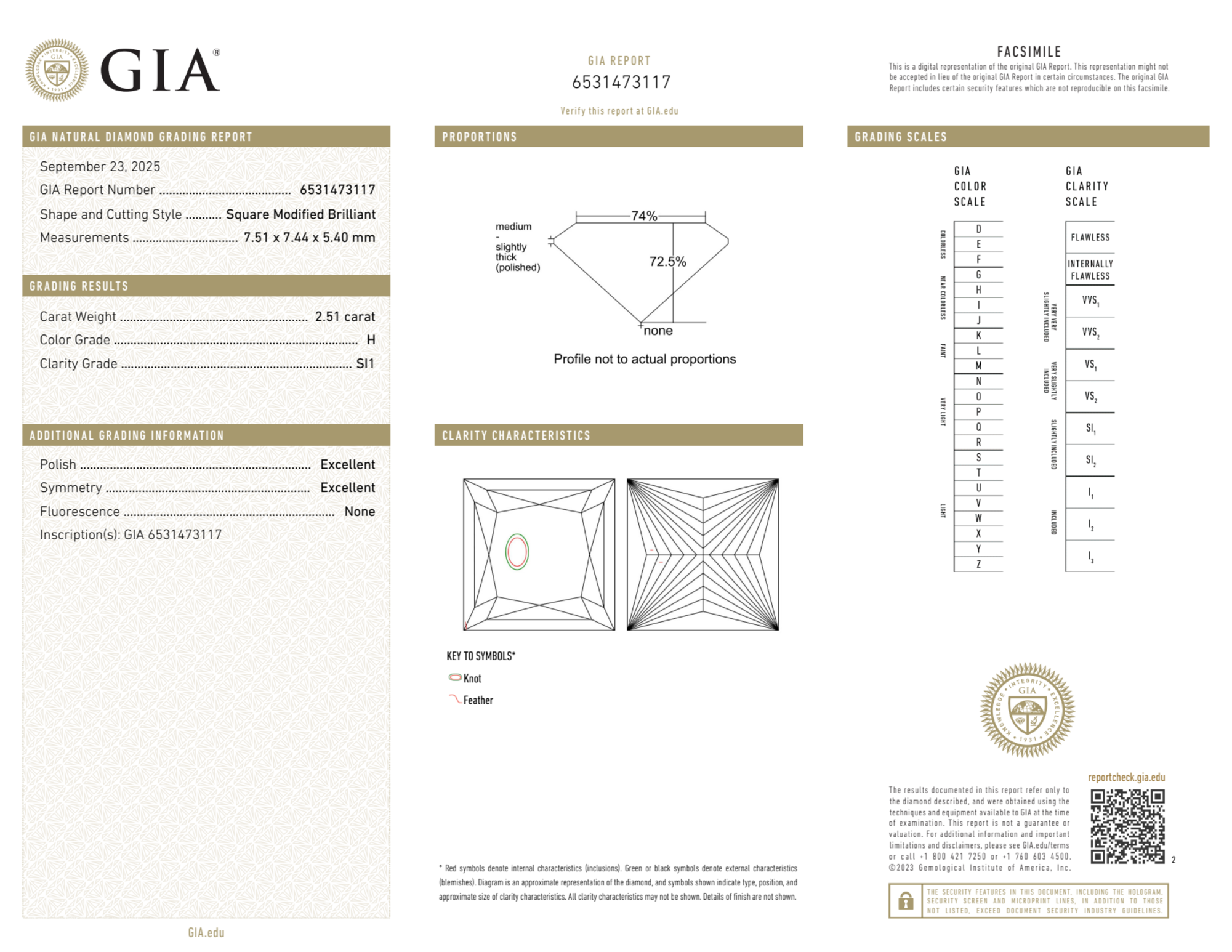 Your 2.51 carat Princess natural diamond is graded H color (Near Colorless), and you can read more about H color diamonds here.