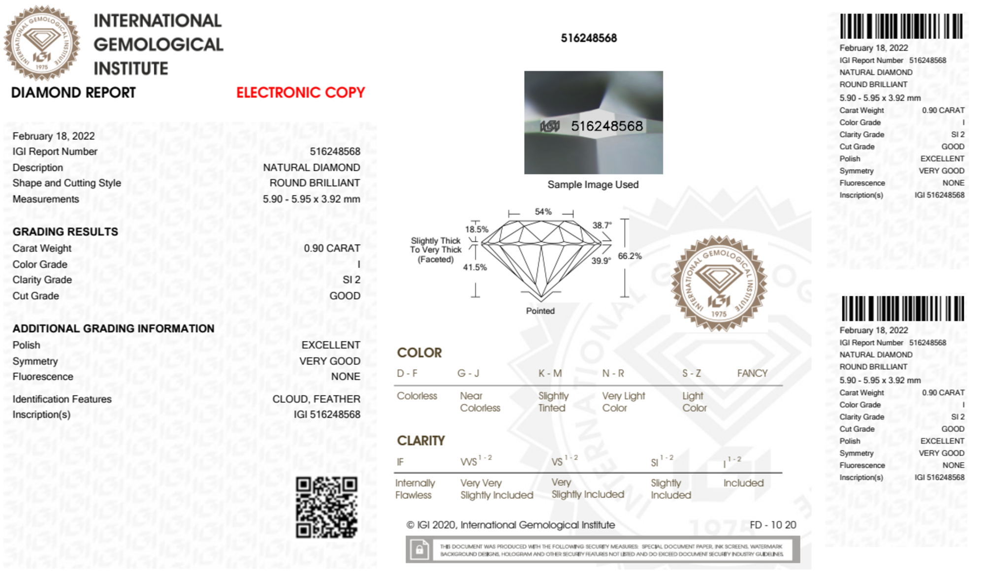 Your 0.90 carat Round natural diamond is graded SI2 clarity, which stands for Slightly Included 2. Read more about SI2 clarity diamonds here, or learn more about diamond clarity in general here.