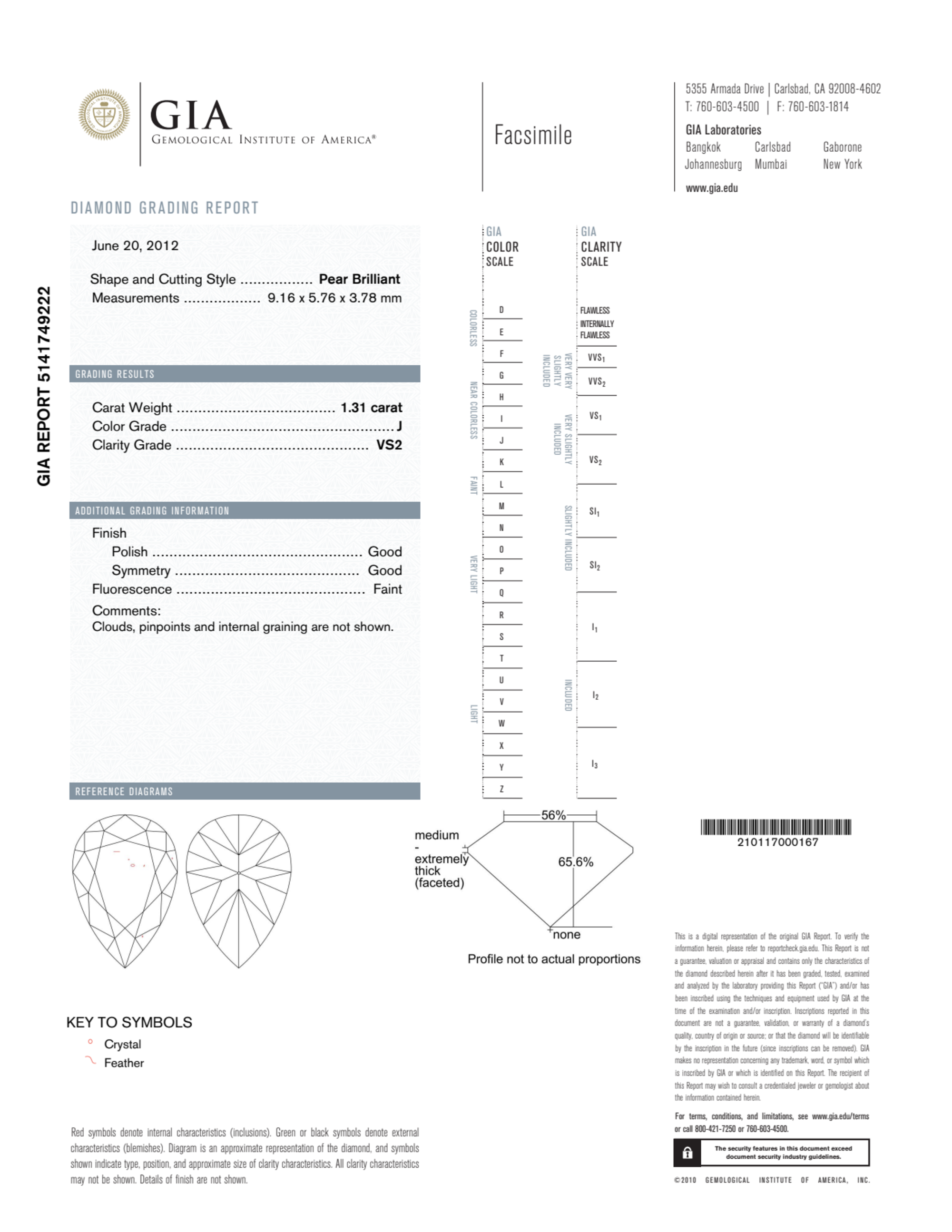 Your 1.31 carat Pear natural diamond is graded VS2 clarity, which stands for Very Slightly Included 2. Read more about VS2 clarity diamonds here, or learn more about diamond clarity in general here.