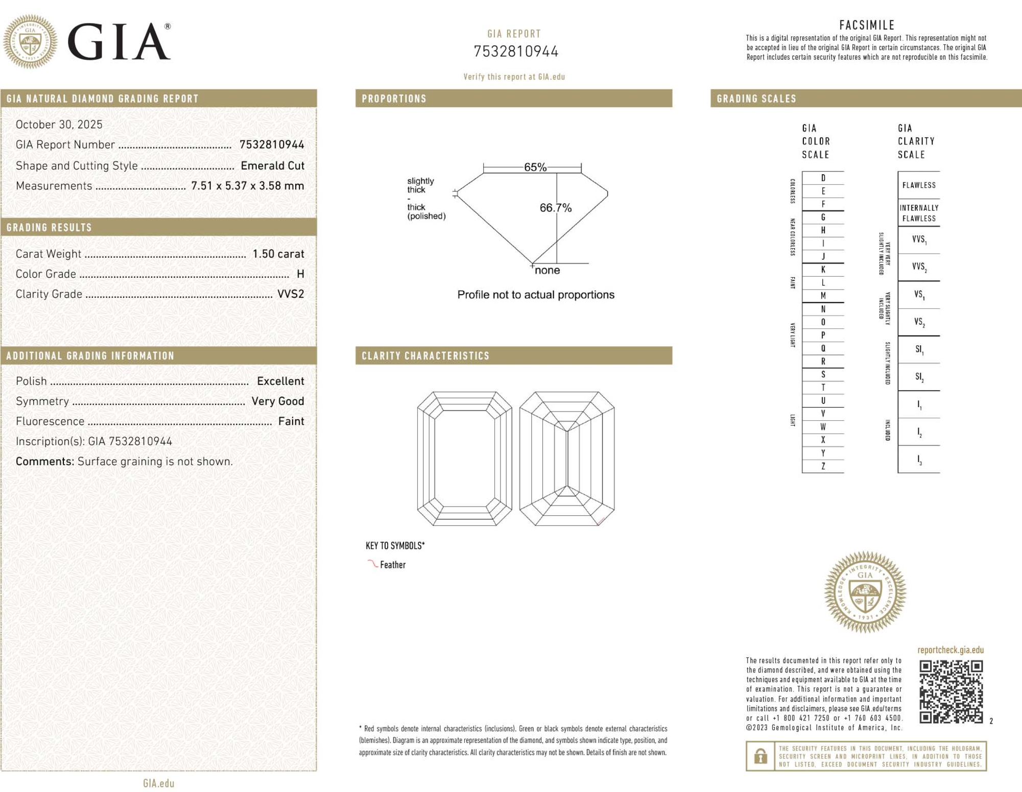 Your 1.50 carat Emerald natural diamond is graded VVS2 clarity, which stands for Very Very Slightly Included 2. Read more about VVS2 clarity diamonds here, or learn more about diamond clarity in general here.