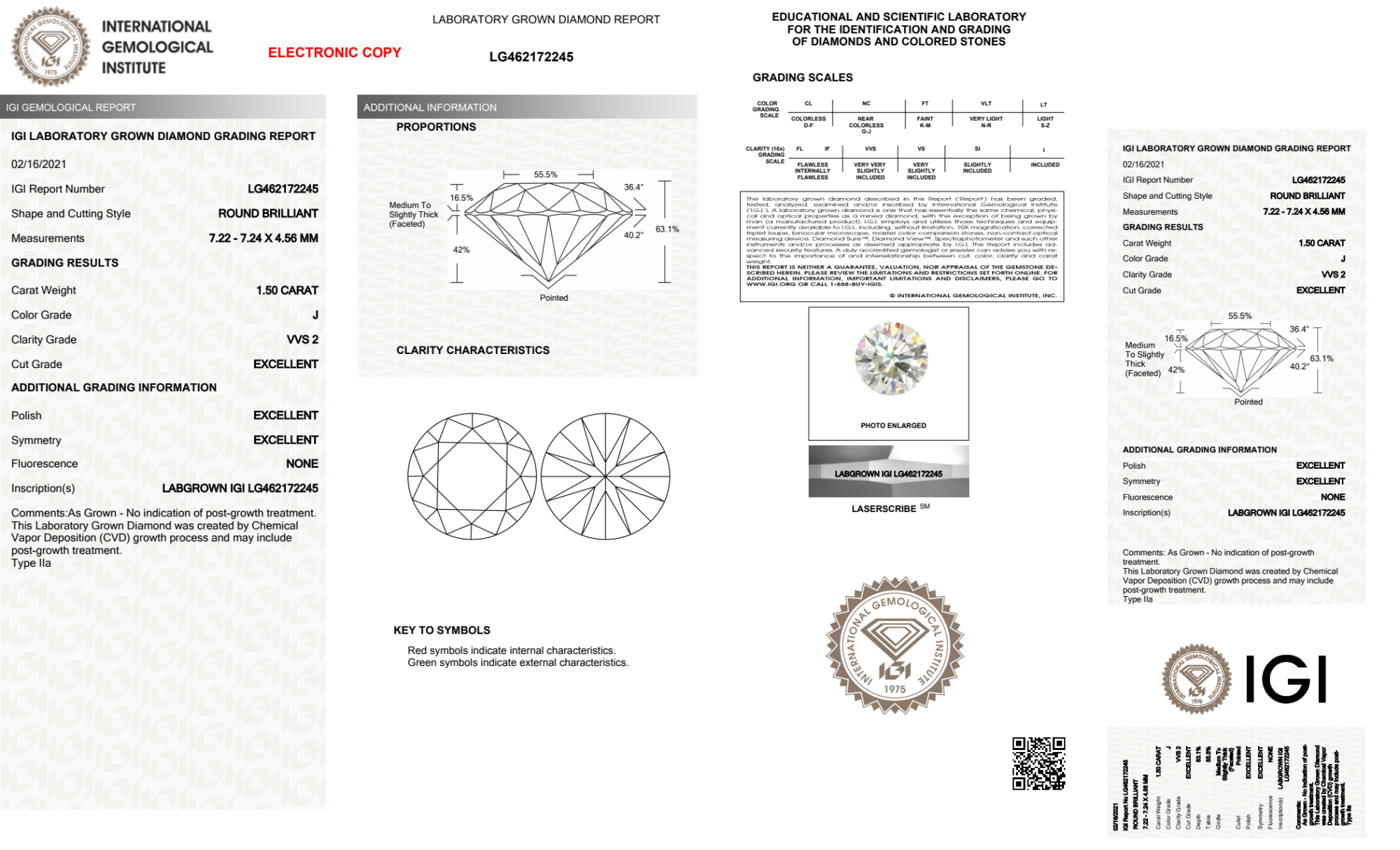 Your 1.50 carat Round lab diamond is graded J color (Near Colorless), and you can read more about J color diamonds here.