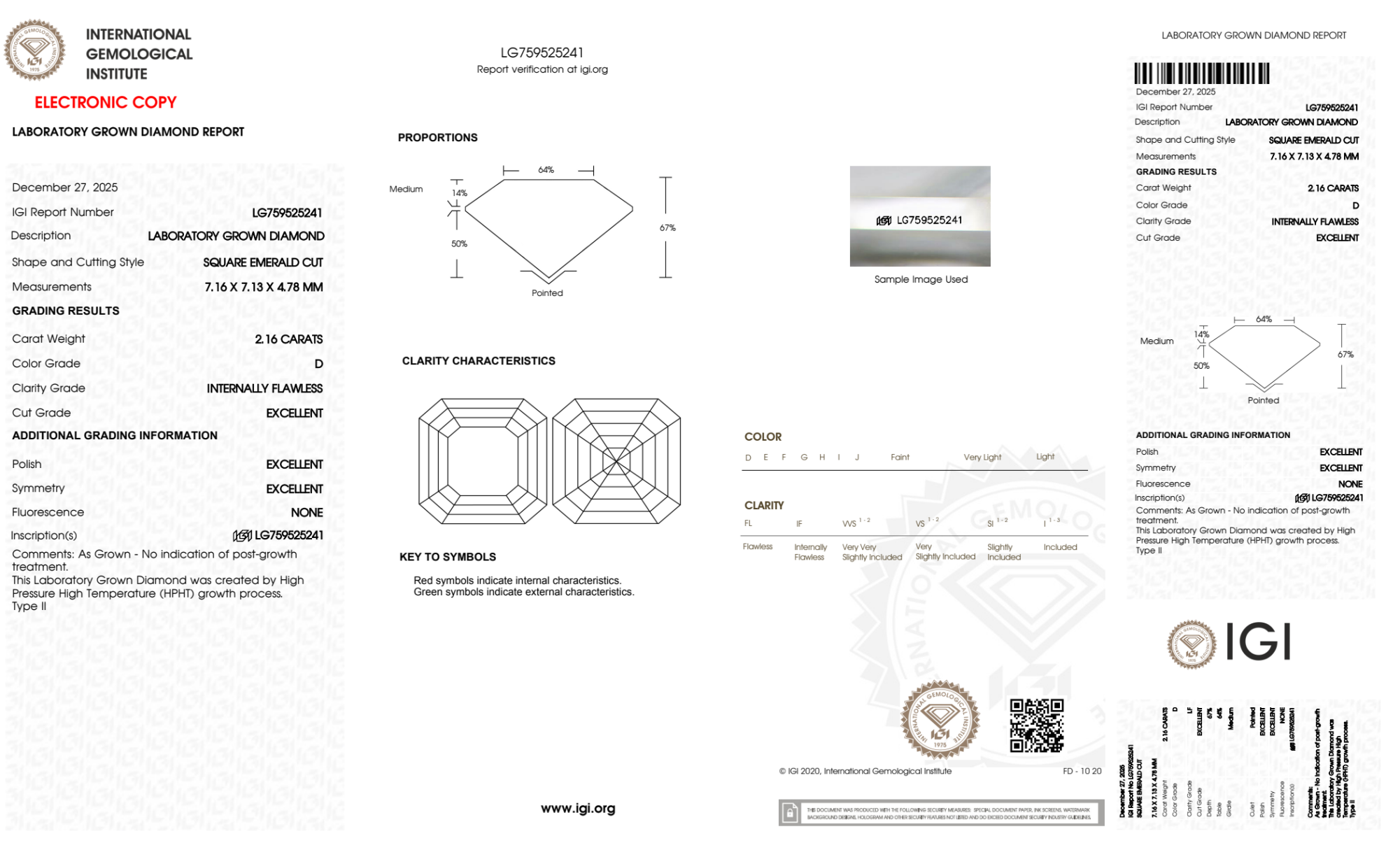 Your 2.16 carat Asscher lab diamond is graded IF clarity, which stands for Internally Flawless. Read more about IF clarity diamonds here, or learn more about diamond clarity in general here.