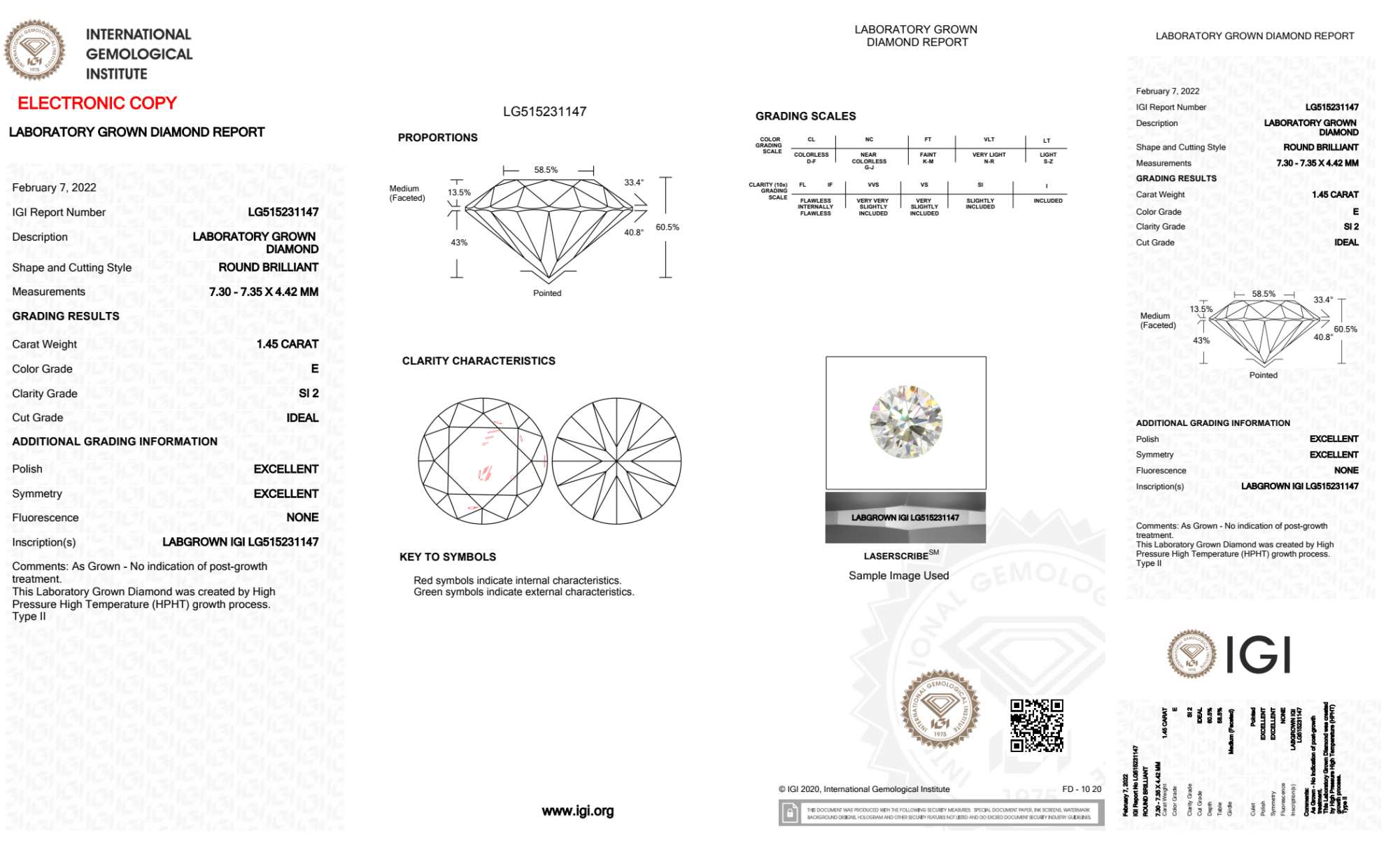 Your 1.45 carat Round lab diamond is graded E color (Colorless), and you can read more about E color diamonds here.