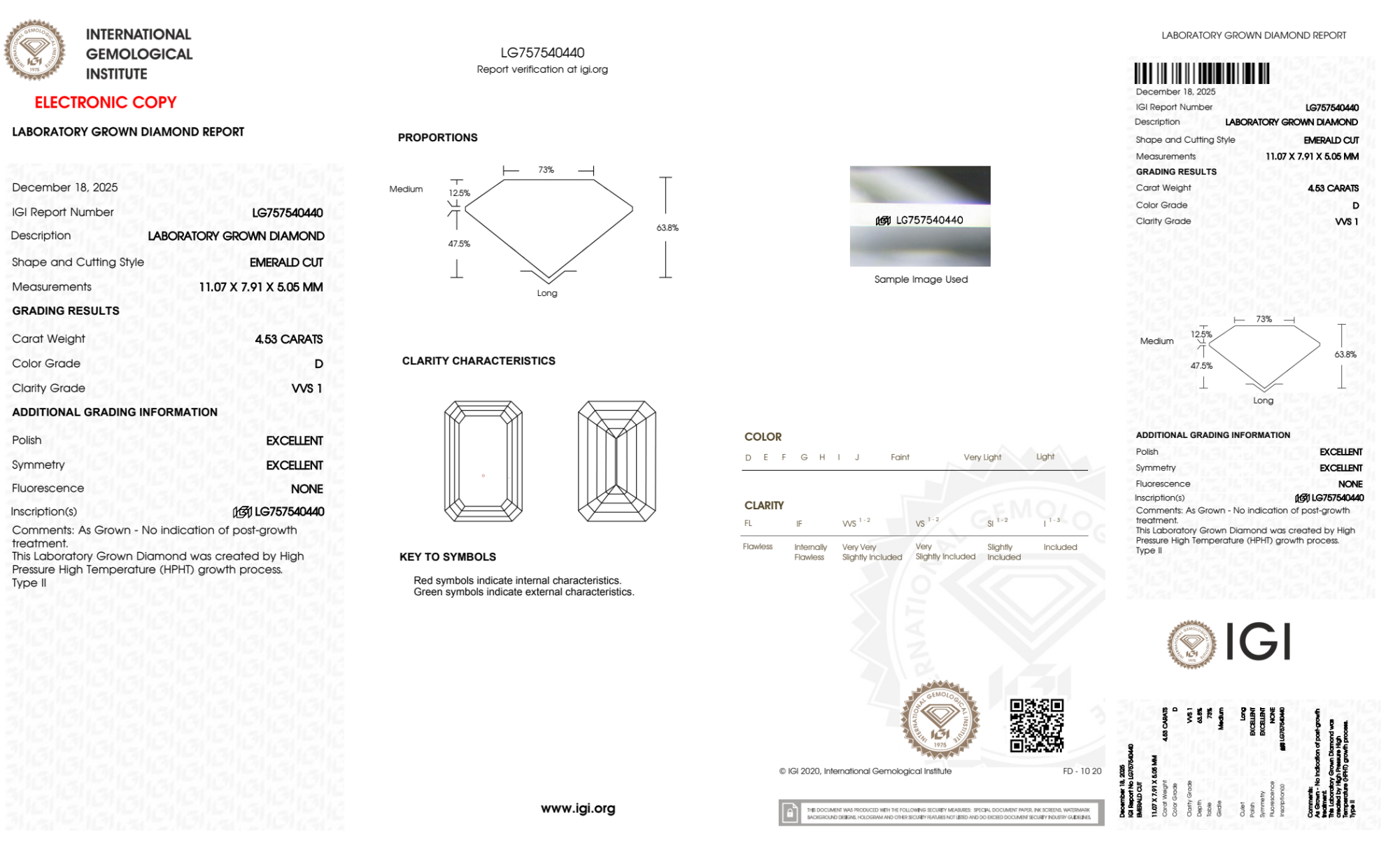 Your 4.53 carat Emerald lab diamond is graded D color (Colorless), and you can read more about D color diamonds here.
