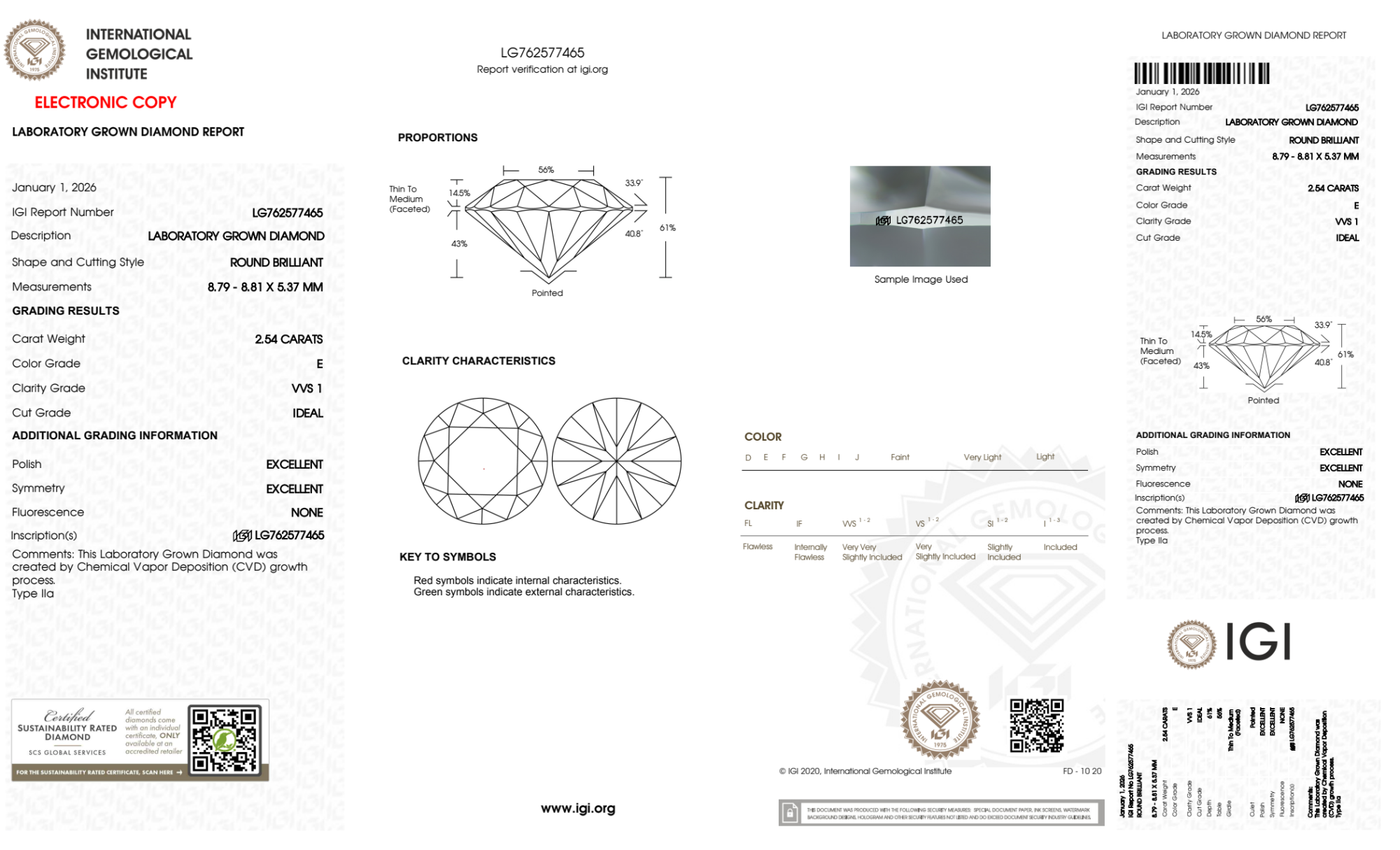 Your 2.54 carat Round lab diamond is graded E color (Colorless), and you can read more about E color diamonds here.