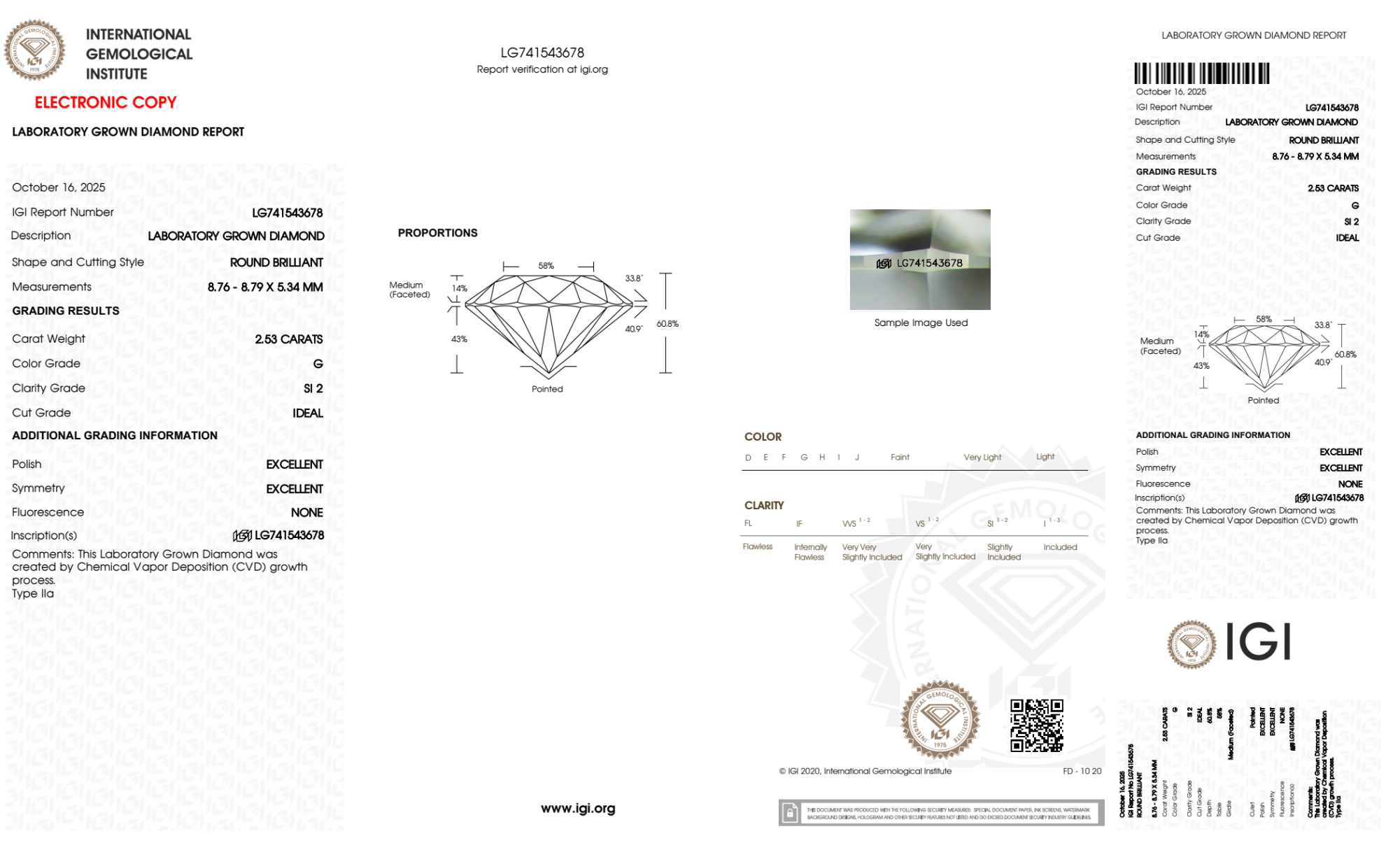Your 2.53 carat Round lab diamond is graded G color (Near Colorless), and you can read more about G color diamonds here.