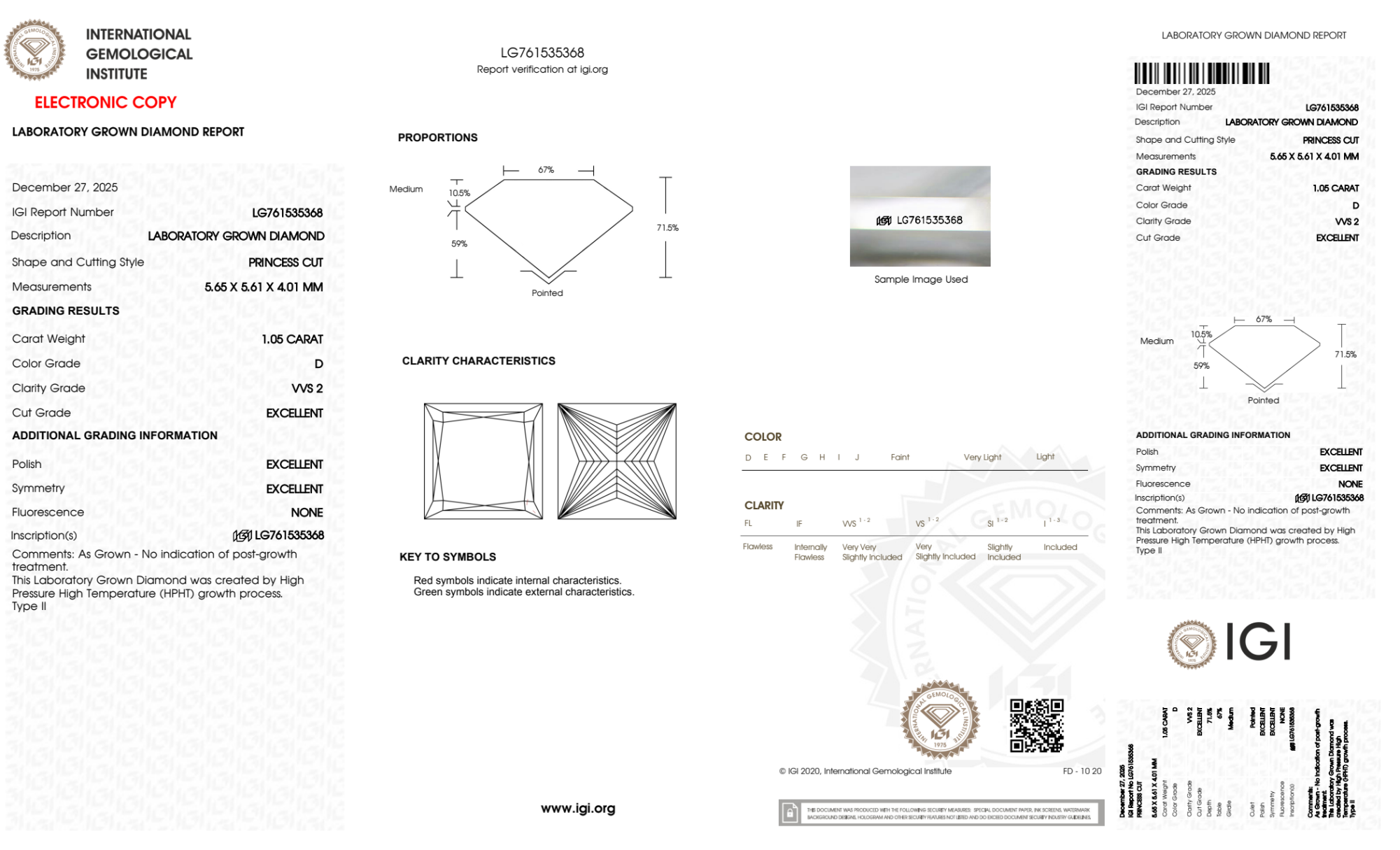 Your 1.05 carat Princess lab diamond is graded D color (Colorless), and you can read more about D color diamonds here.