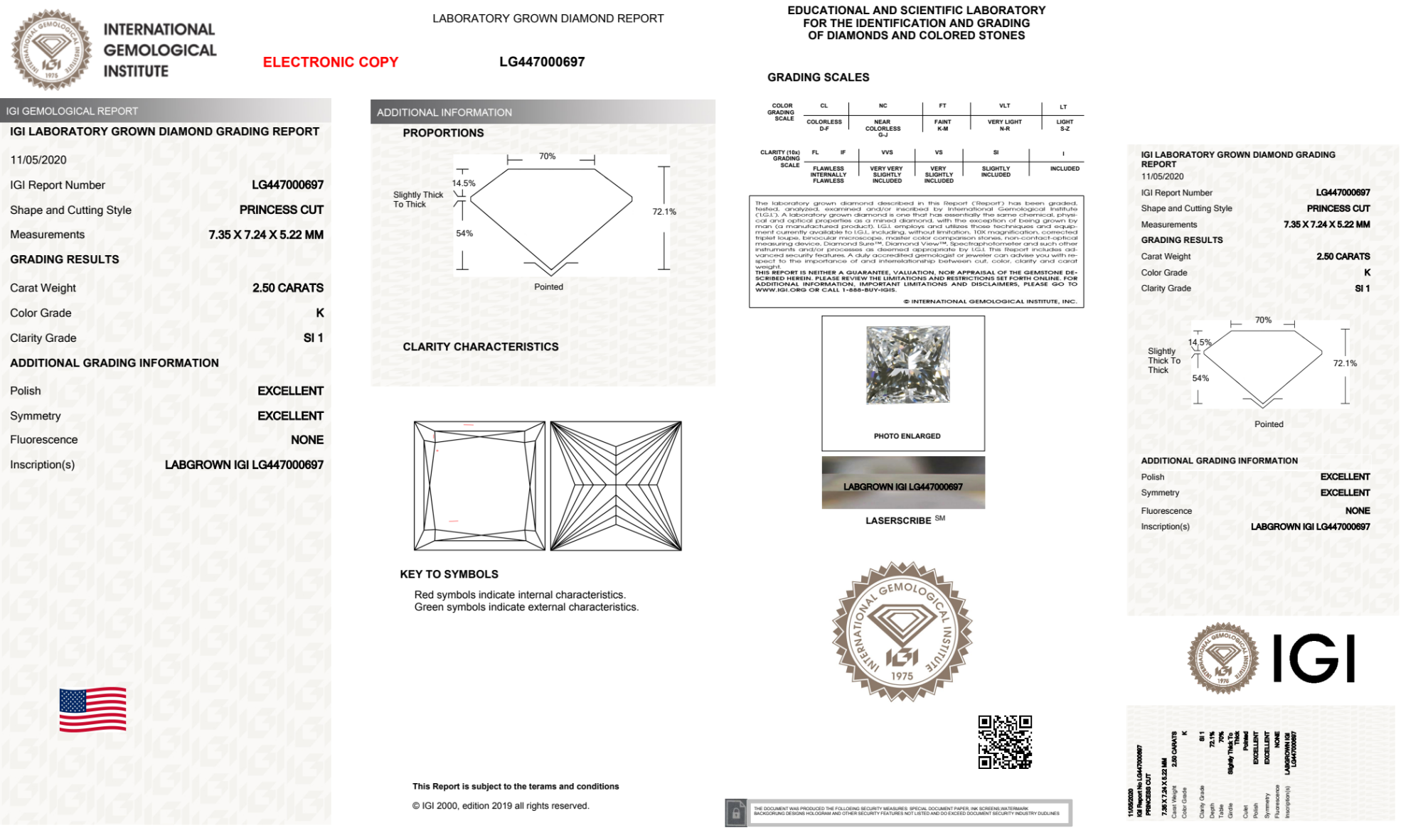 Your 2.50 carat Princess lab diamond is graded SI1 clarity, which stands for Slightly Included 1. Read more about SI1 clarity diamonds here, or learn more about diamond clarity in general here.