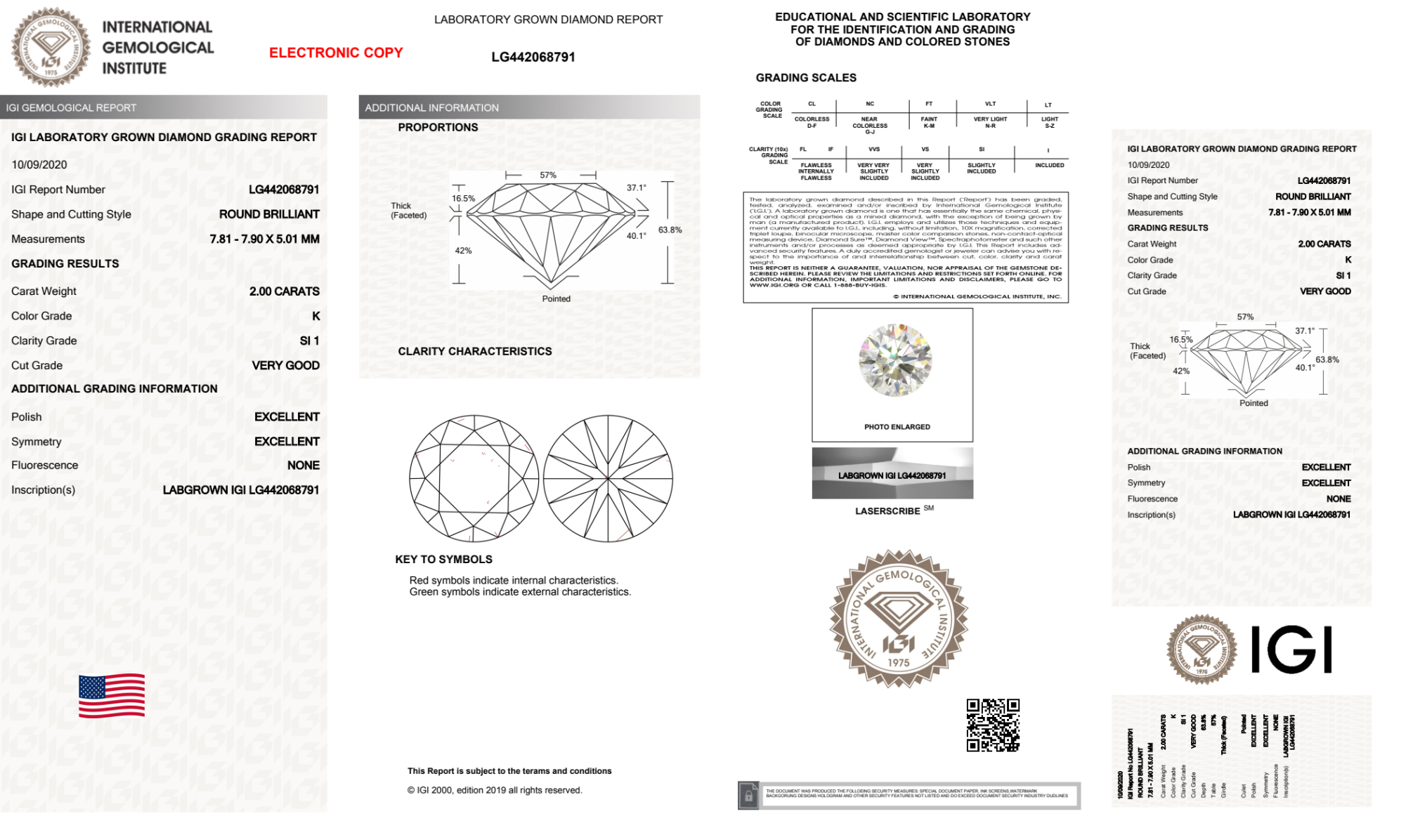 Your 2.00 carat Round lab diamond is graded SI1 clarity, which stands for Slightly Included 1. Read more about SI1 clarity diamonds here, or learn more about diamond clarity in general here.