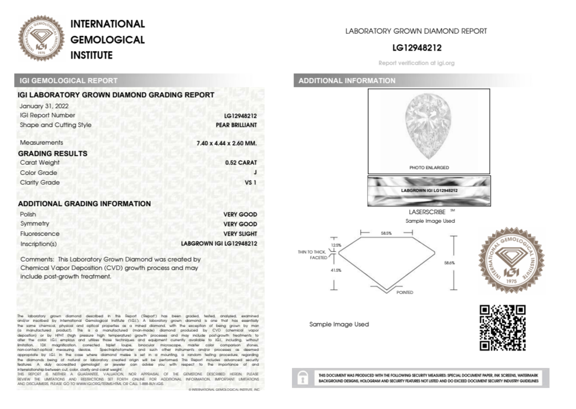 Your 0.52 carat Pear lab diamond is graded J color (Near Colorless), and you can read more about J color diamonds here.