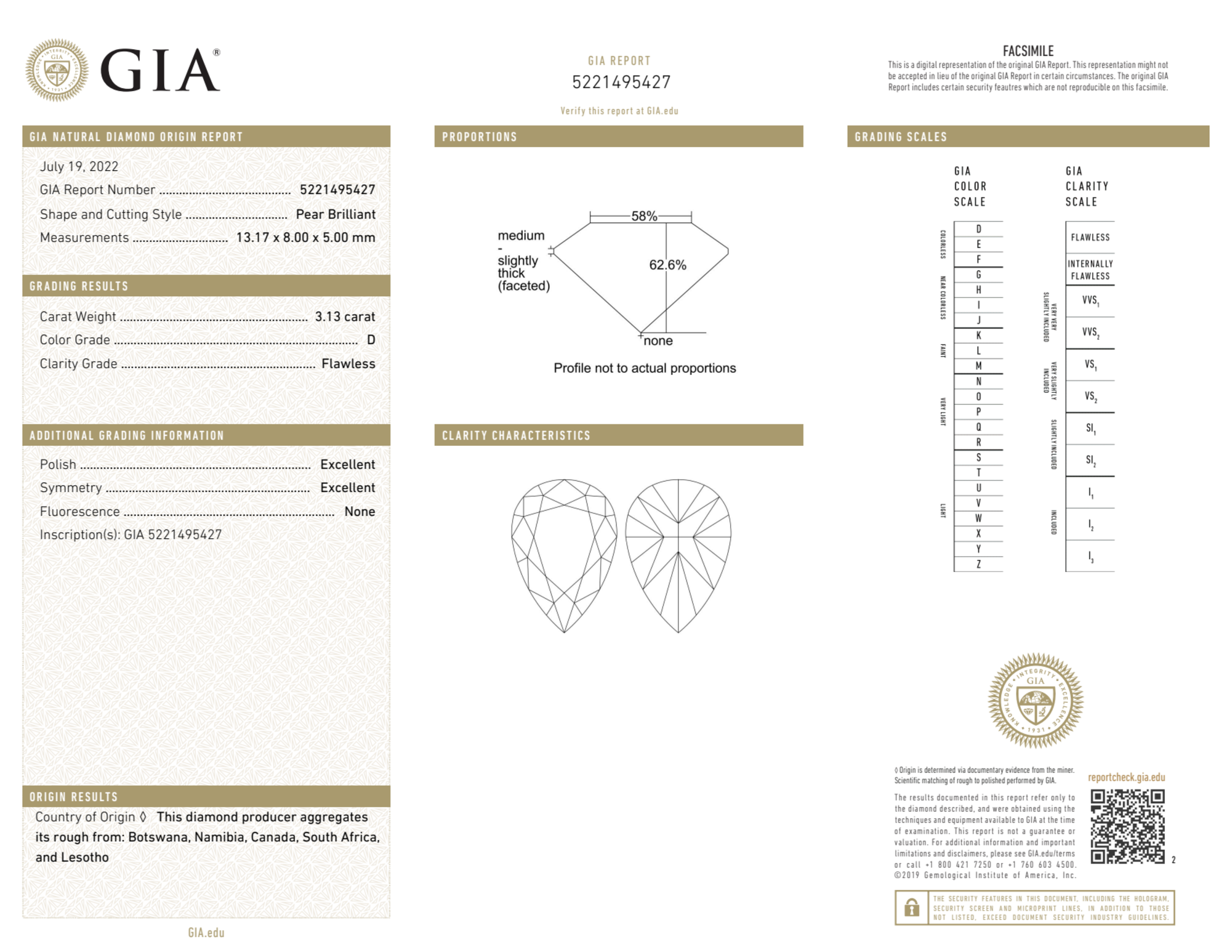 Your 3.13 carat Pear natural diamond is graded D color (Colorless), and you can read more about D color diamonds here.